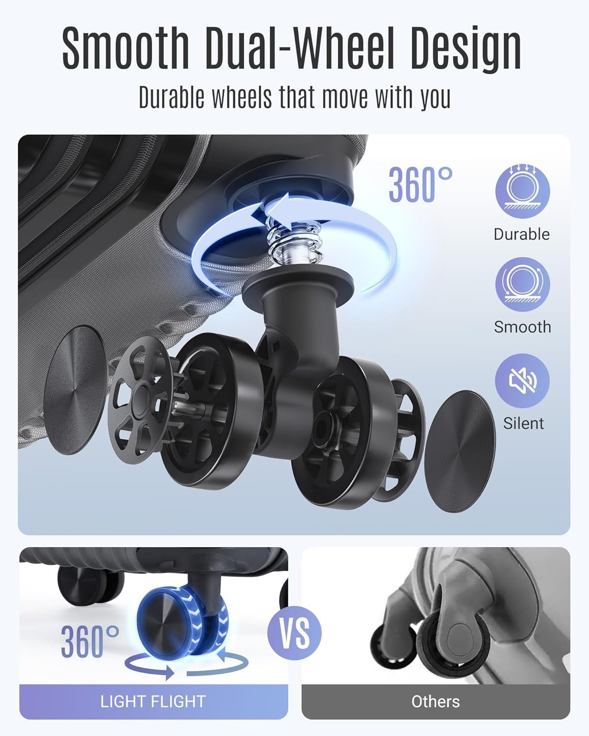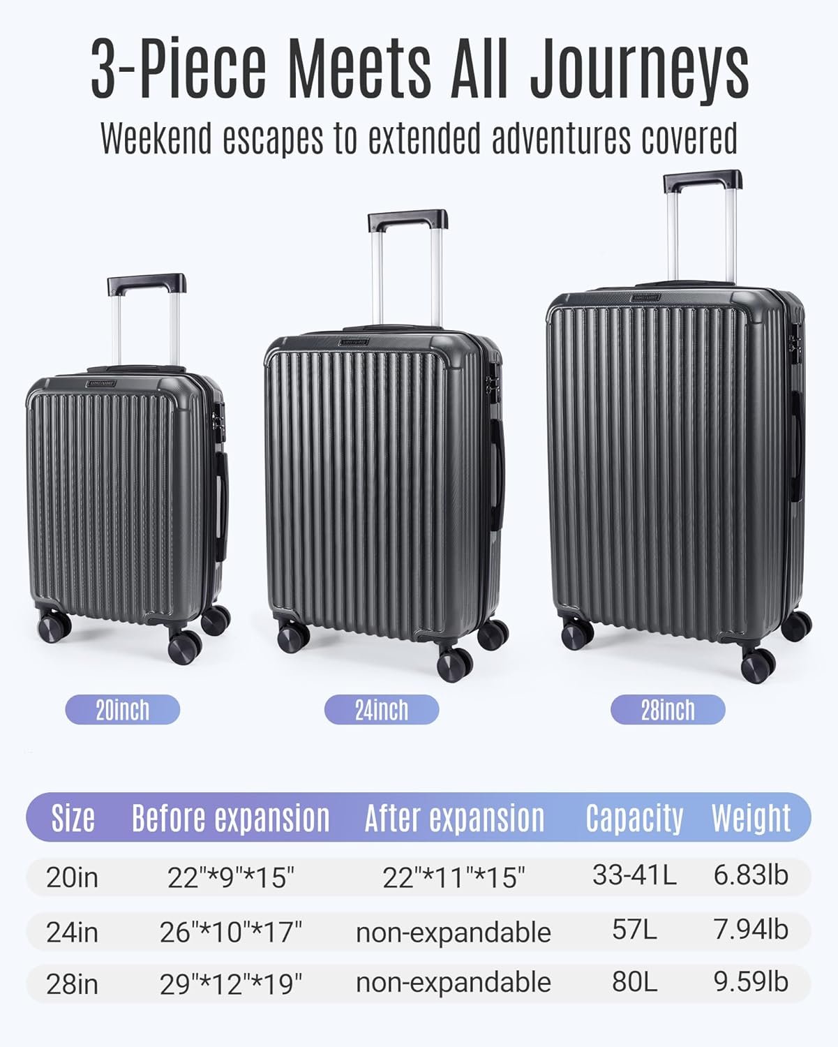 Travel Smart, Pack Light​​: Domestic trips or global adventures? We’ve got your back. The set includes a 20-inch carry-on (perfectly carry-on friendly for short-haul flights) paired with a 24″/28″ spinner suitcase. Expand your packing potential with the larger suitcase’s roomy interior—ideal for long-haul adventures where every inch counts.