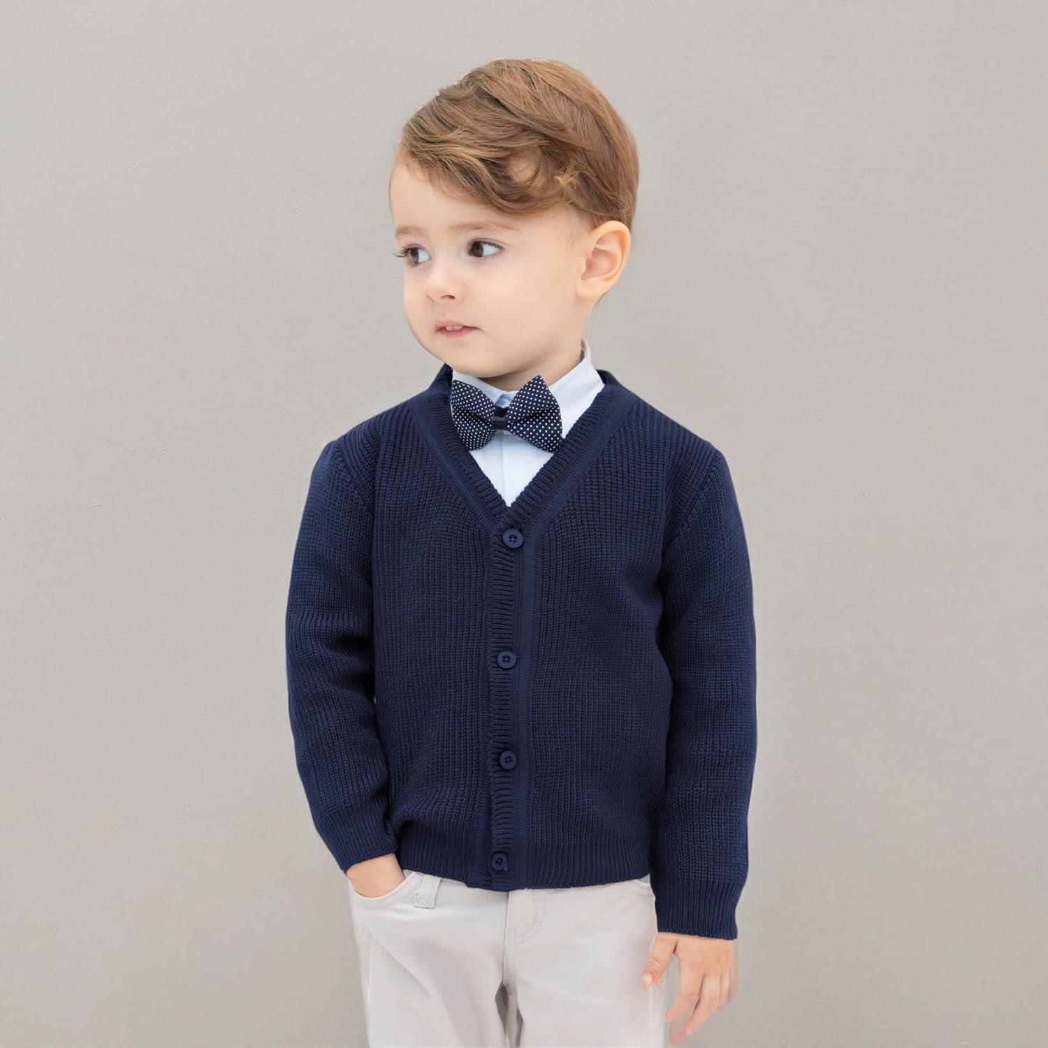 Featuring a classic V-neck, full-length sleeves, and easy button closure, this baby boy cardigan blends timeless style with everyday practicality. This spring sweater is crafted from soft, breathable fabric to keep your little one cozy and stylish all day long — perfect for layering in any season.