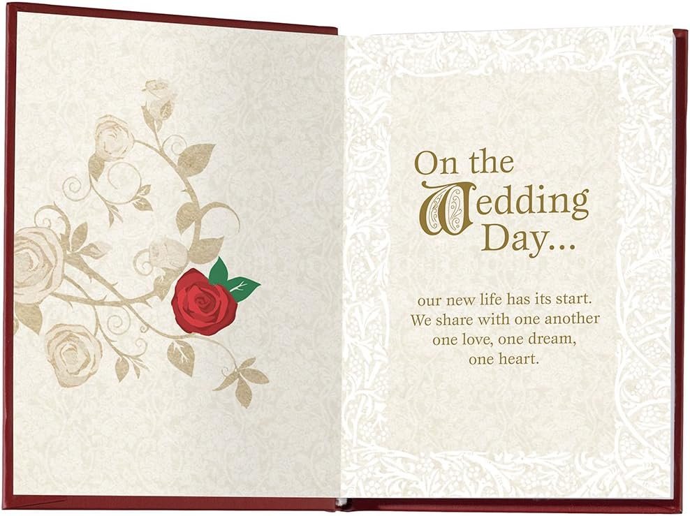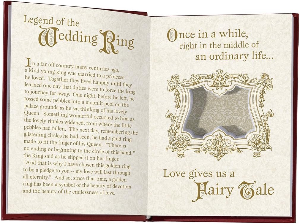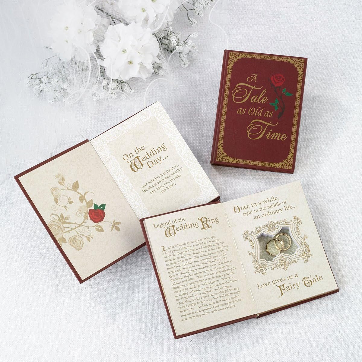 Lillian Rose red/gold fairy tale storybook ring holder. This charming ring box is shaped like a fairy tale book, complete with an ornate cut-out inside, perfect for holding the wedding rings. Ring holder measures 6 inch long by 4.25 inch wide.