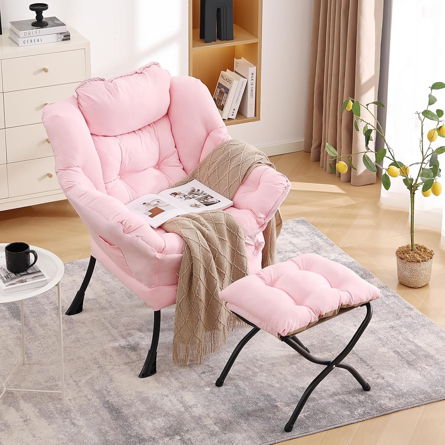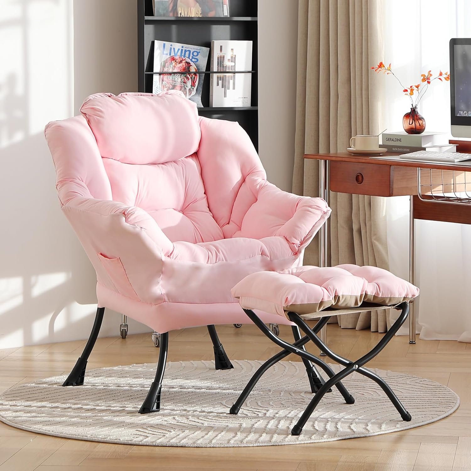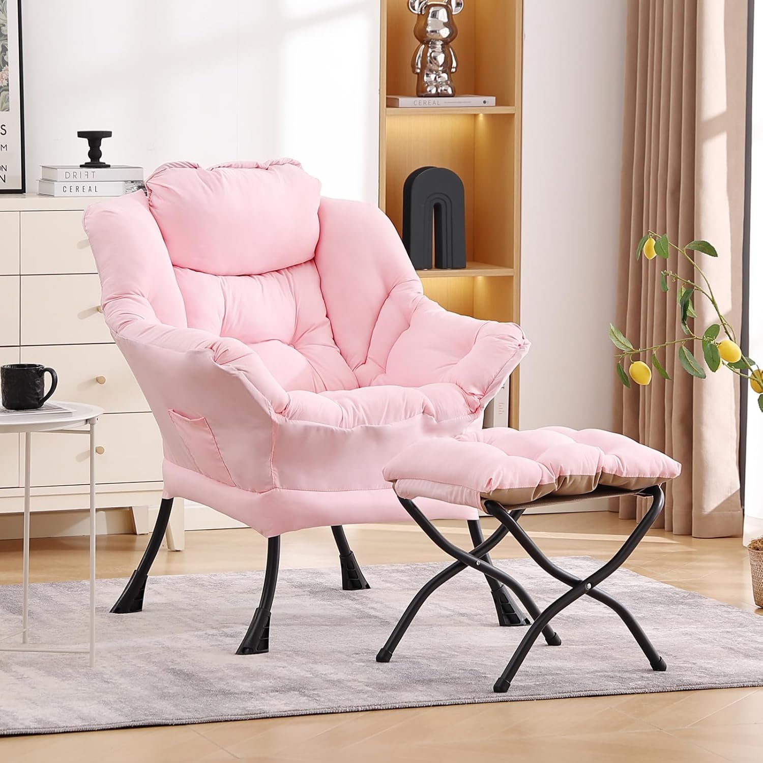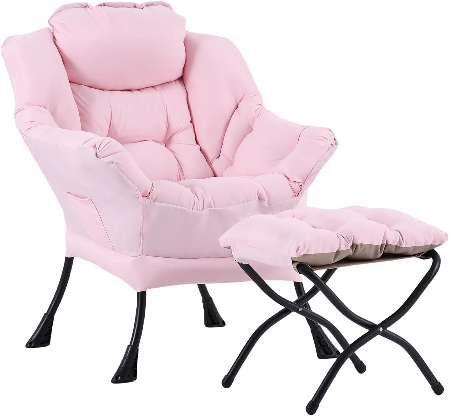 LITA Lazy Chair with Ottoman, Modern Accent Leisure Upholstered Sofa, Contemporary Lounge Reading Chair with Armrests and a Side Pocket for Living Room, Bedroom & Small Space, Pink