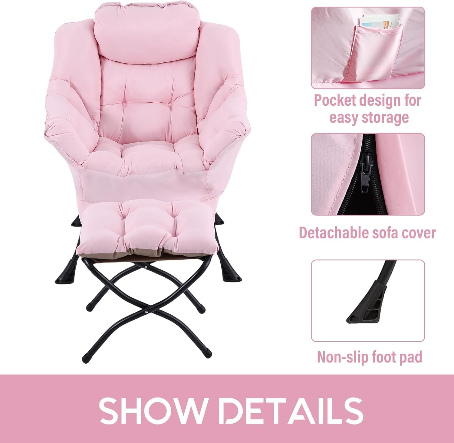 DURABLE ACCENT CHAIR: The leisure chair features the strong steel frame with powder spray coating. And it also has a middle tube to well support the whole chair. Can hold up to 400lbs. Moreover, footstool cover of the chair prevents slip, which makes you sit still and protect the floor