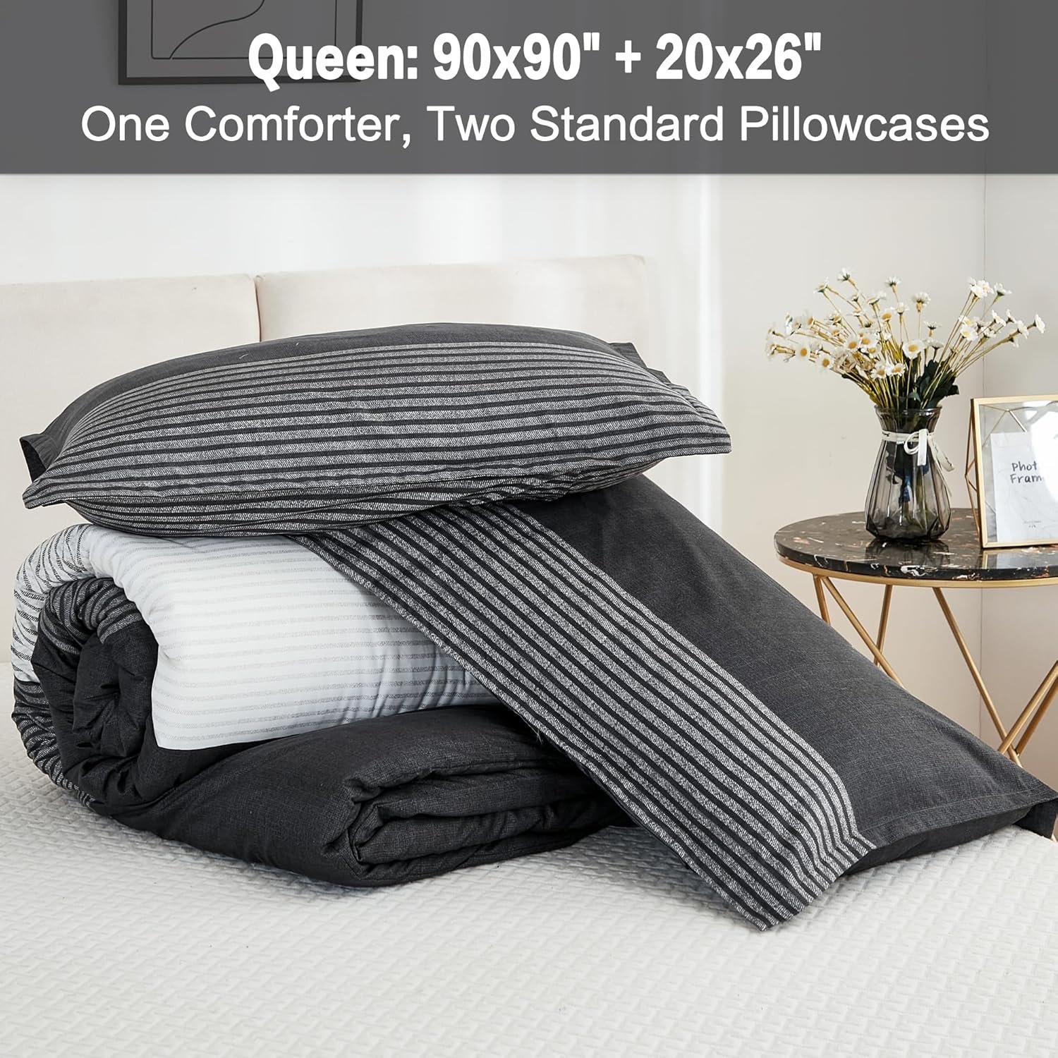 [ PACKAGE INCLUDES ] Queen Size Down Alternative Comforter Set: 1 stripe comforter queen (90×90 inches) with corner loops (can be fixed with your duvet cover), 2 envelope pillowcases (20×26 inches). Vacuum packaging. *Due to manual cutting, pattern of pillow sham is random. The pillow insert is not included.