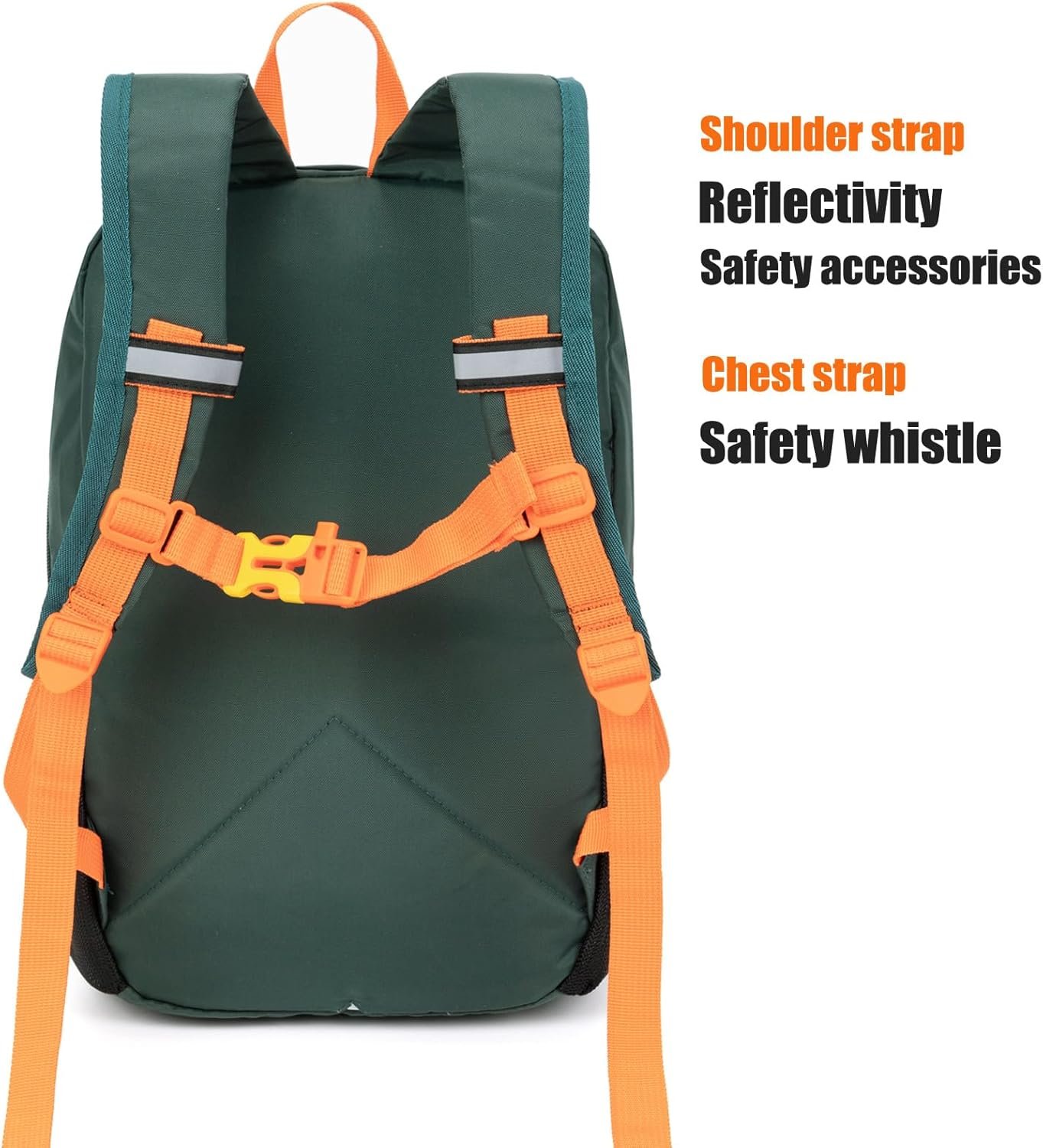 Safety features: a toy whistle on the chest strap, a big reflective strip in the front pocket, and 2 small reflective strips on the shoulder straps
