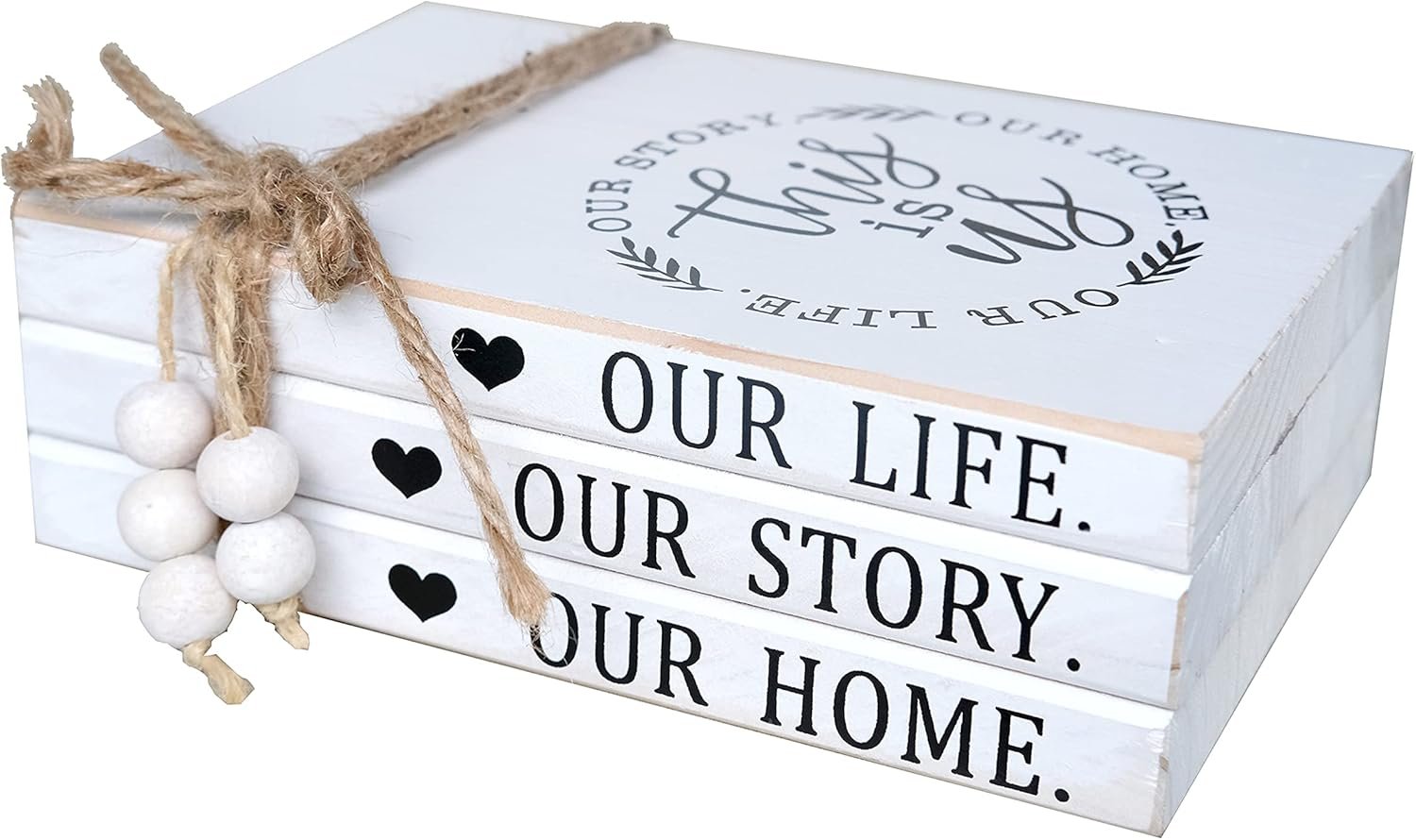 【HANDCRAFTED WOOD BOOK STACK】This farmhouse stacked books decor consists of 3 books made of solid cedarwood. White painted with slight distressing finish. Warm quote “this is us” printed on top book face, while books’ spine has heart decored “OUR LIFE. OUR STORY. OUR HOME”. 3 farmhouse wood books glued together, won’t move to get loose, bookstack bound with rustic twine,the hemp rope’s ends are threaded with white wood beads.