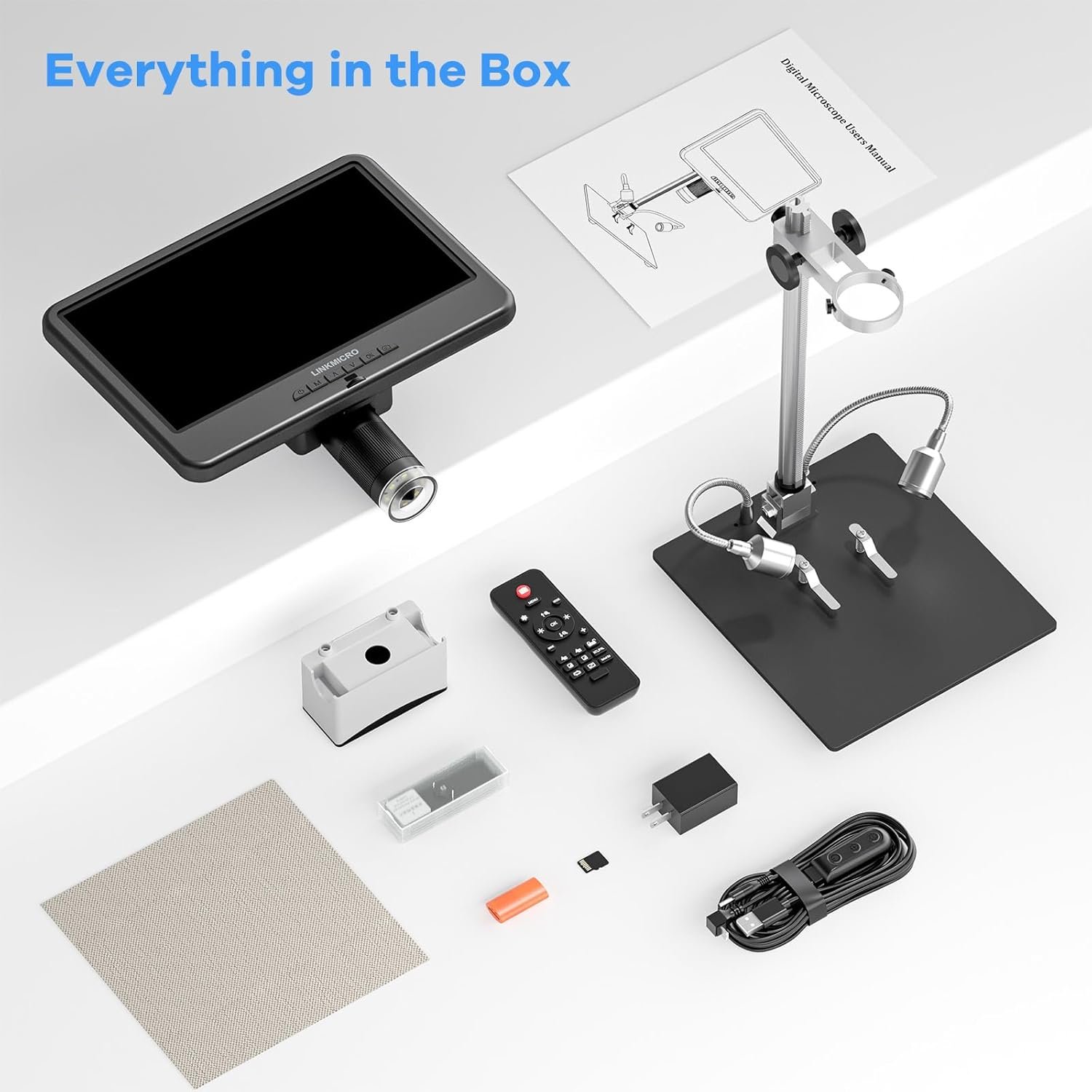 【What’s in the Box】 ①10″ Microscope ② Big Metal base③ 26cm columns with gears④ Remote control⑤ Power adapter⑥ Switch cable⑦ Wrench &Metal clips⑧ 32G SD card⑨ Cleaning cloth ⑩ Card Reader⑪ User manual