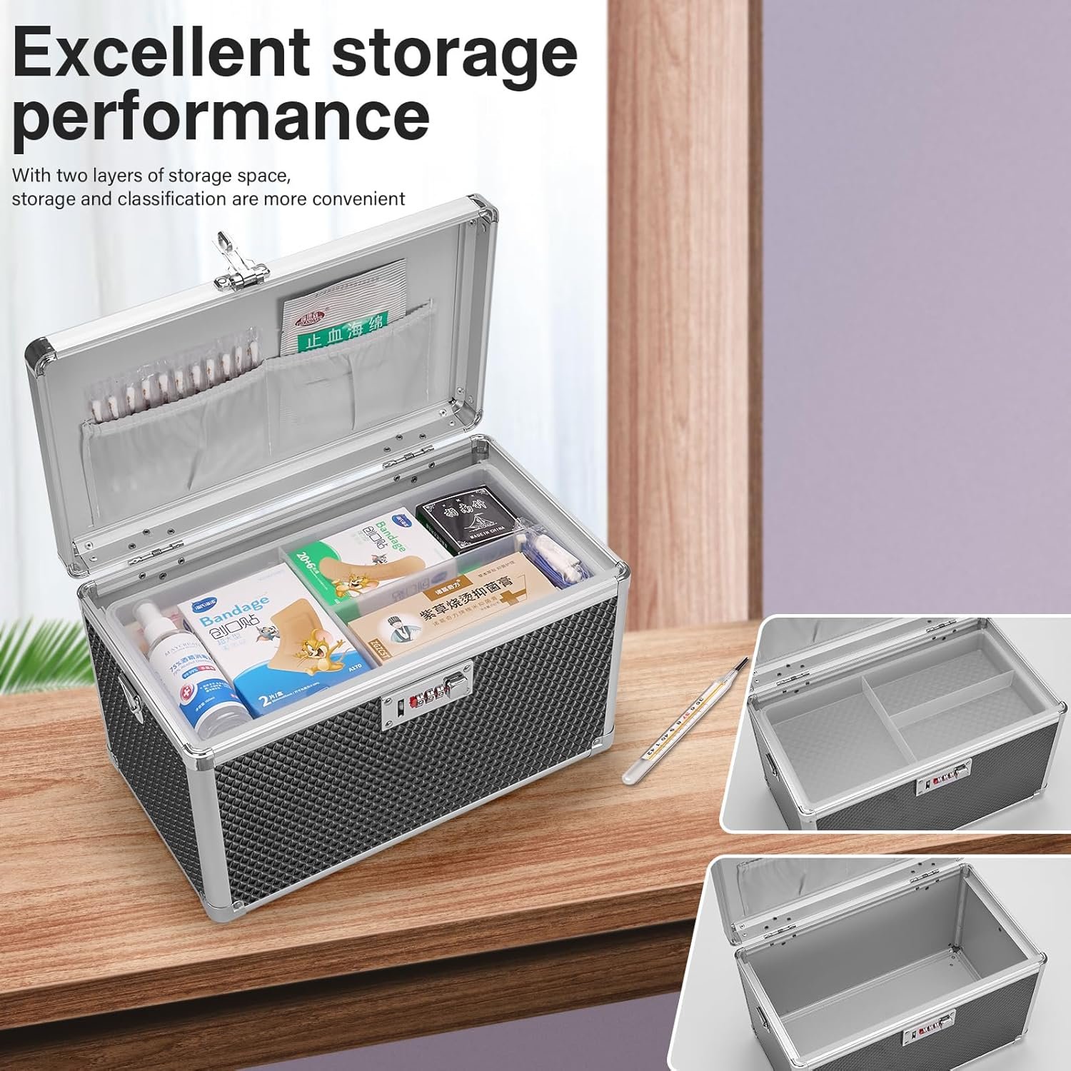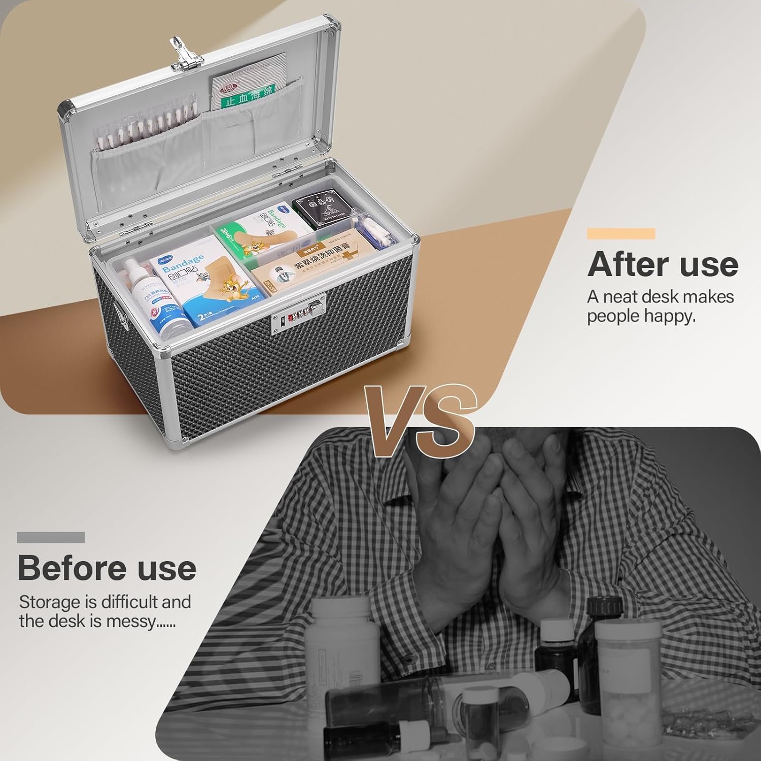 Efficient Divided Storage: Organize your medical and emergency supplies with storage pockets and a tray in the security lock box. Quickly store smaller items like band-aids, adhesive tape, medications, pills, and cotton balls