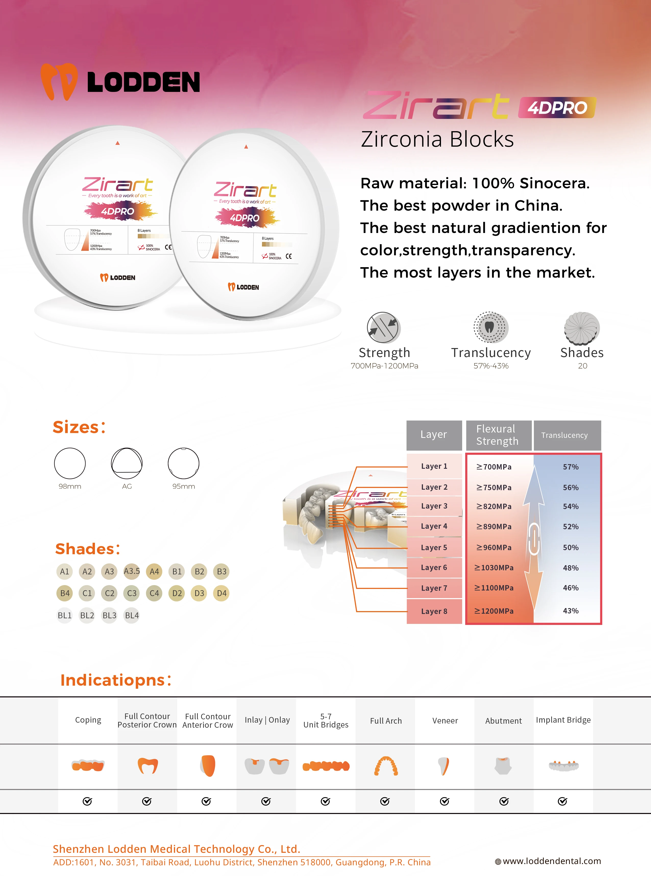 LODDEN Dental Lab Zirconia Block 4D Pro 98mm for Dental CAD CAM Crown Transparency 43-57% Strength 700-1200 VITA 16& BL1-4