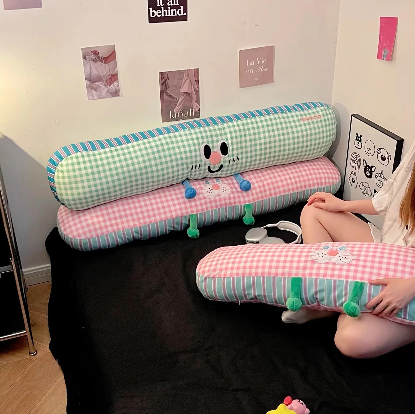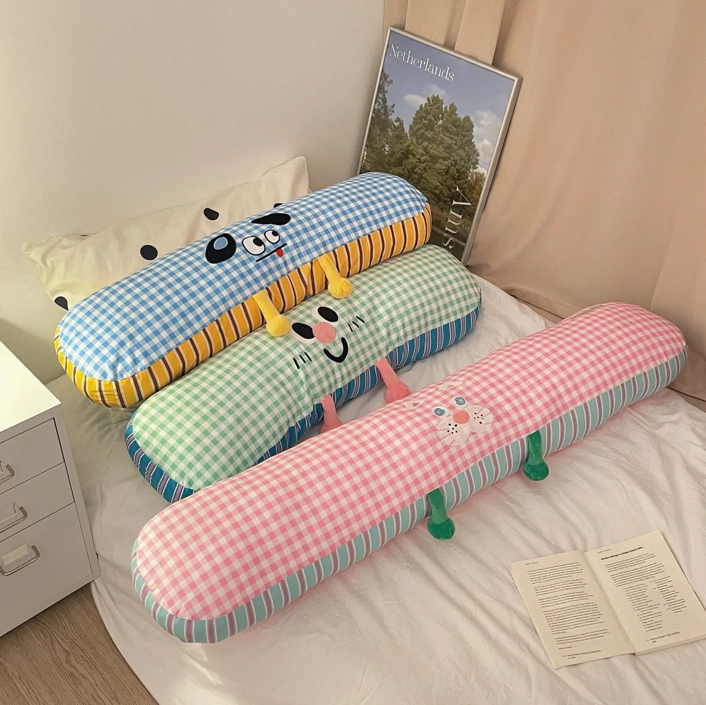 Long Cartoon Grid Pillow for Girls, Legs Tucked, Sleeping on The Side, Pillow on The Bed, Dopamine Cushion, Sofa, Large Backrest