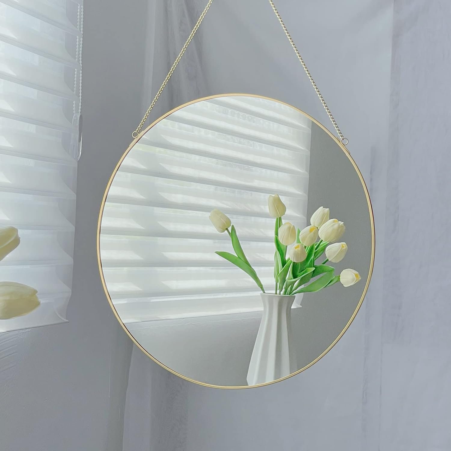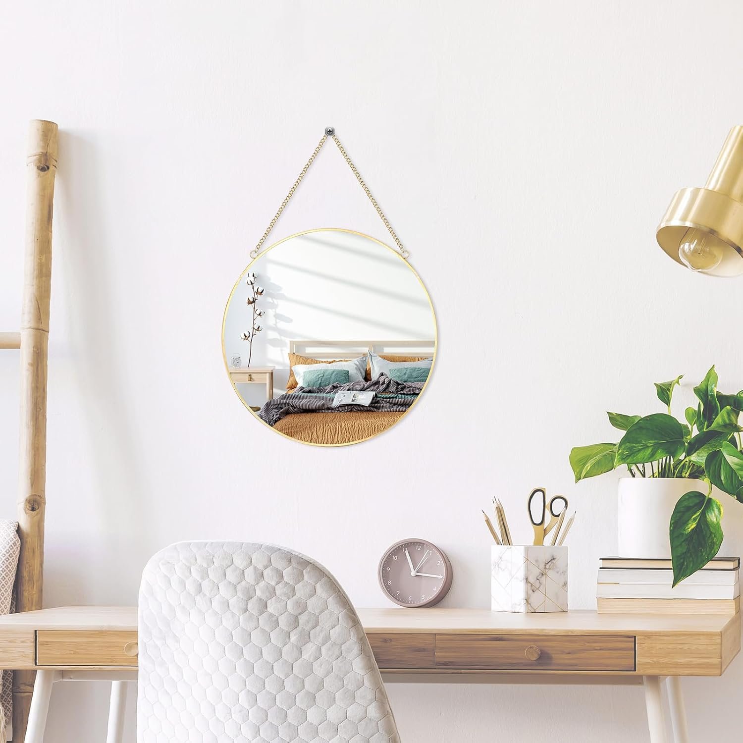 Various usage: Gorgeous round hanging wall mirror great for entryway, living room, bathroom, bedroom vanity, gallery wall and hallway, put on the desk is also a beautiful view.