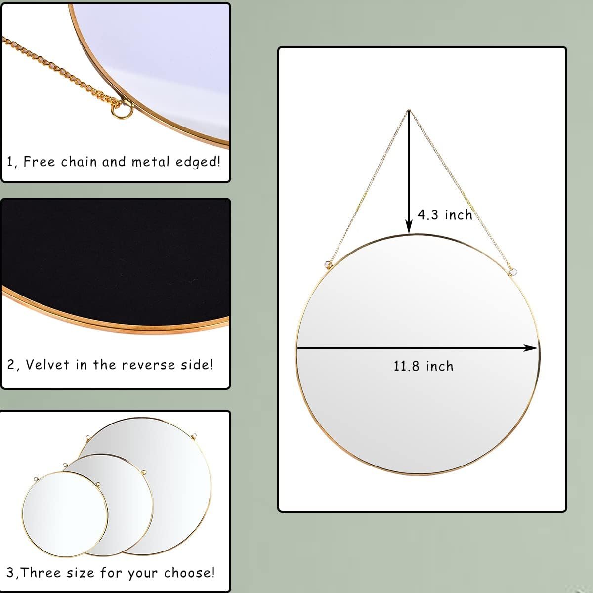 p>Material of the hanging gold brass mirror: metal edge and glass with velvet in the reverse side.Specification: mirror measured 300mm(11.8inch) in diameter, 588g(1.3lb) in net weight.