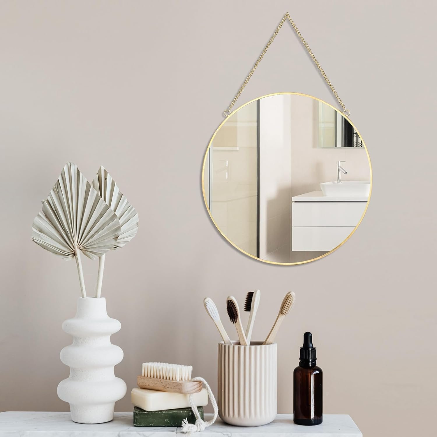 LONGWIN Hanging Wall Circle Mirror Decor Gold Geometric Mirror with Chain for Bathroom Bedroom Living Room 11.8″