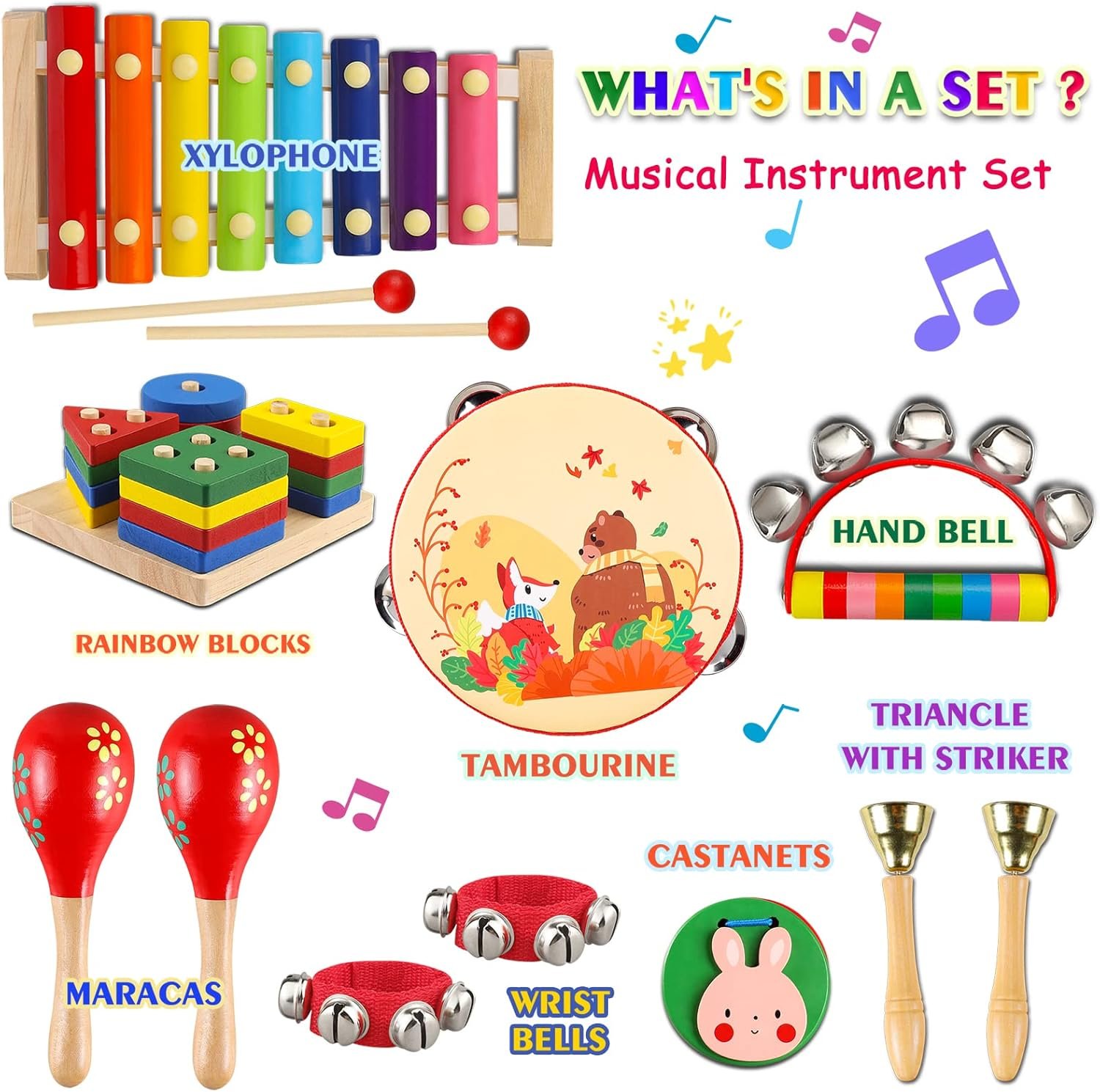 【Musical Toys For Toddlers Set】These baby musical instruments set is very bright color. The set of kids musical instruments is various including rainbow blocks, tambourine, maracas, wrist bells, hand bell, castanets and two triancle with striker.