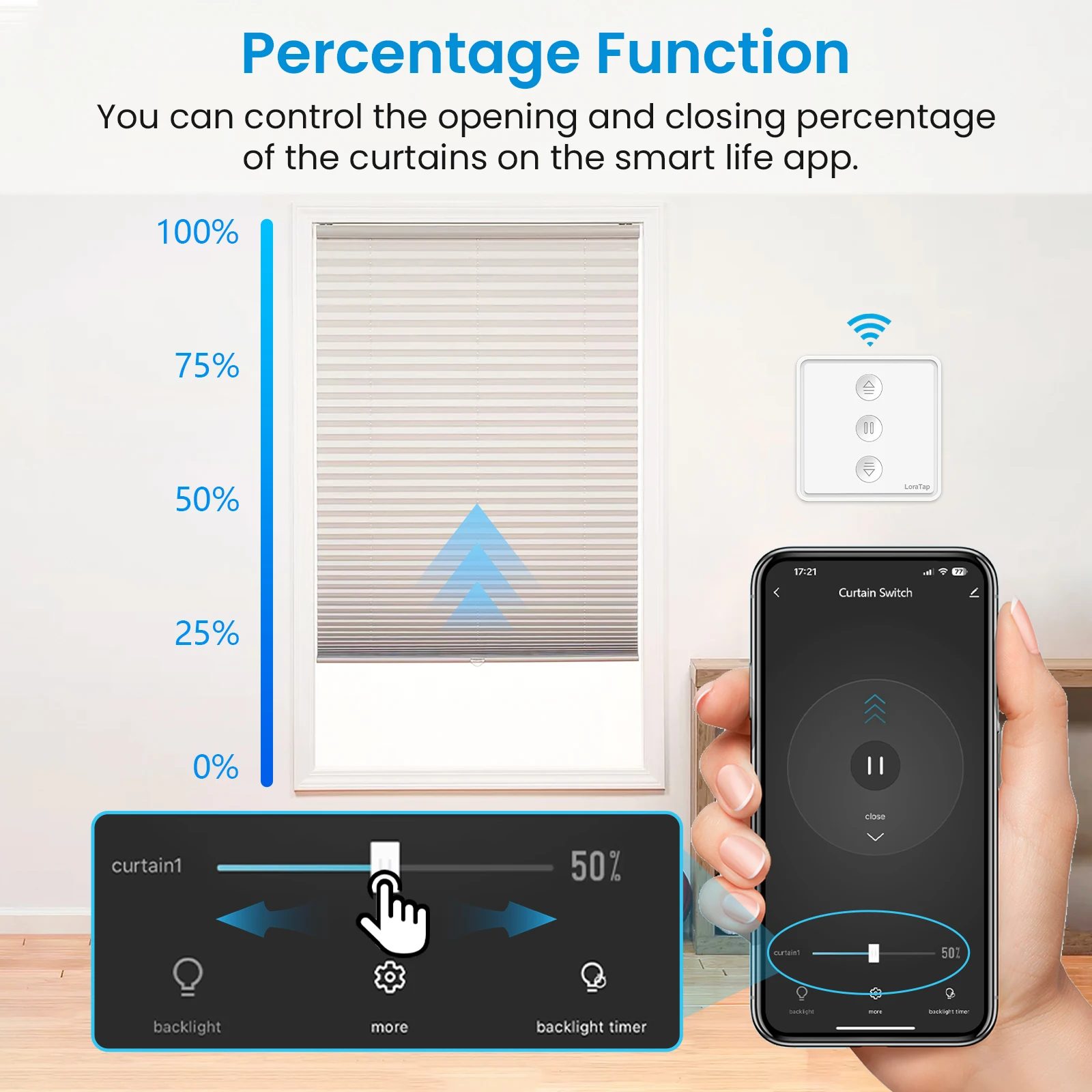 • Curtain Percentage Control: Accurately control roller shutter at specify percentage position via App.