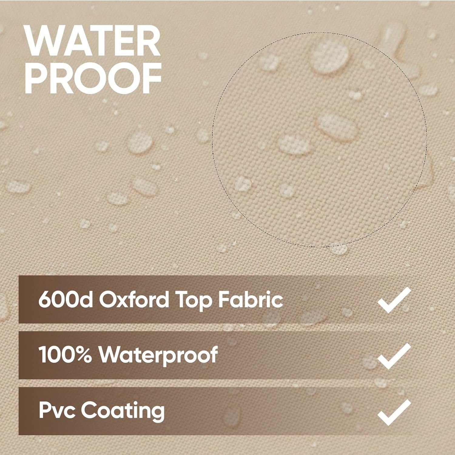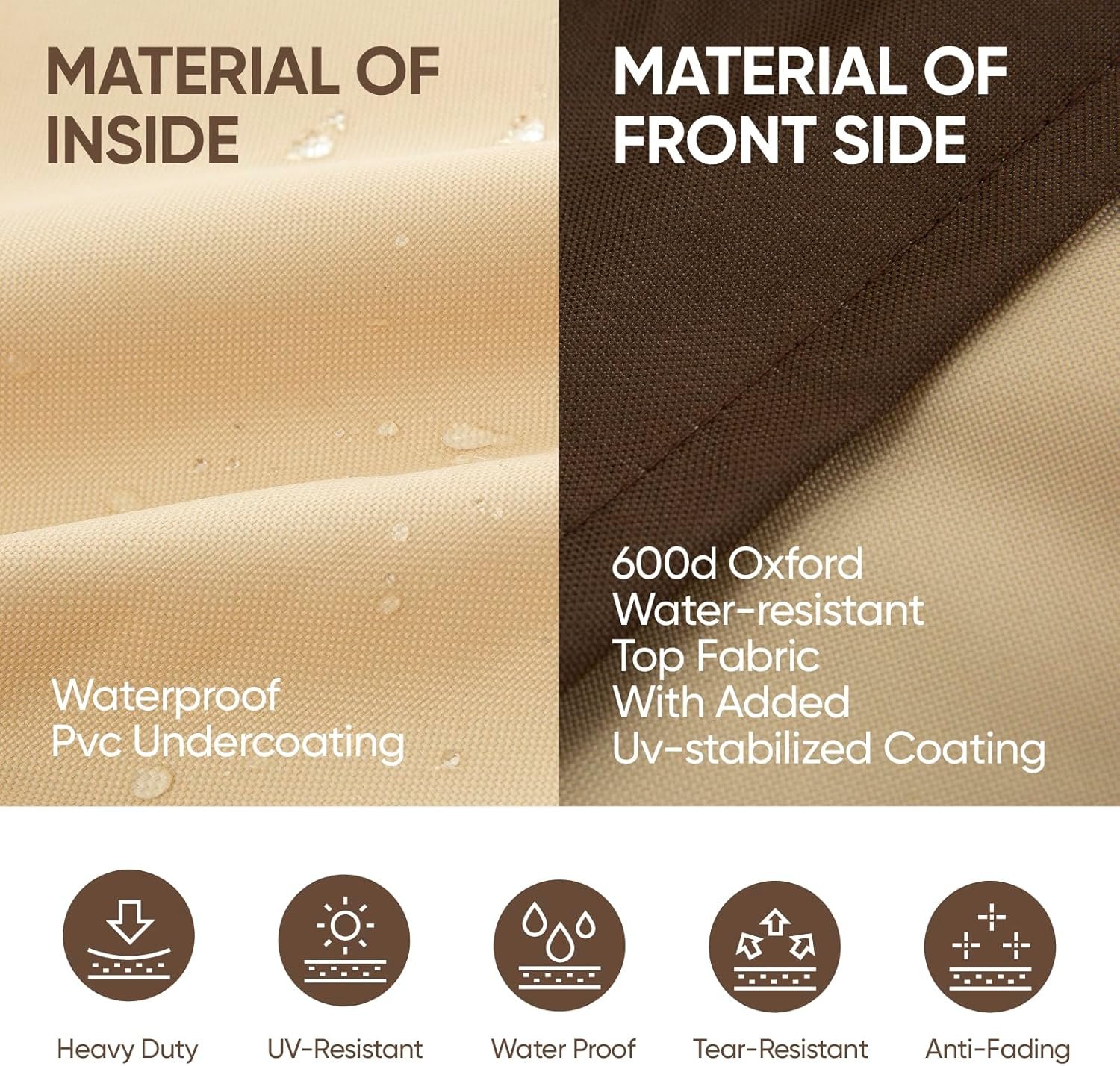 WATERPROOF: Heavy duty 100% 600D Oxford water-resistant top fabric with added UV-stabilized coating and waterproof undercoating is made to protect your patio furniture cover from natural damage and outdoor elements like sun, dirt, rain, snow.