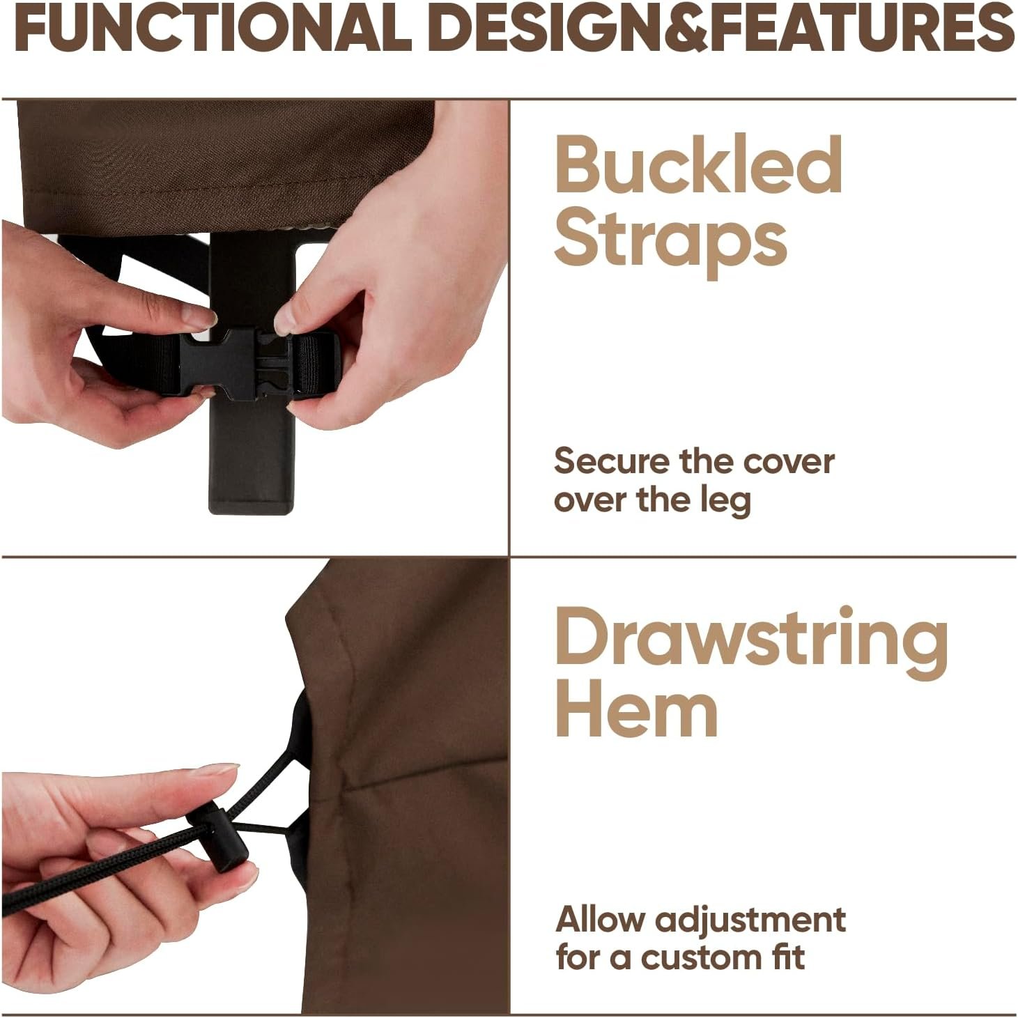 WINDPROOF: The elastic hem cord with adjustable toggle allows you to make a tight custom fit on the bottom of the outdoor chair covers. Buckled straps over legs provide extraordinary security on the windiest days.