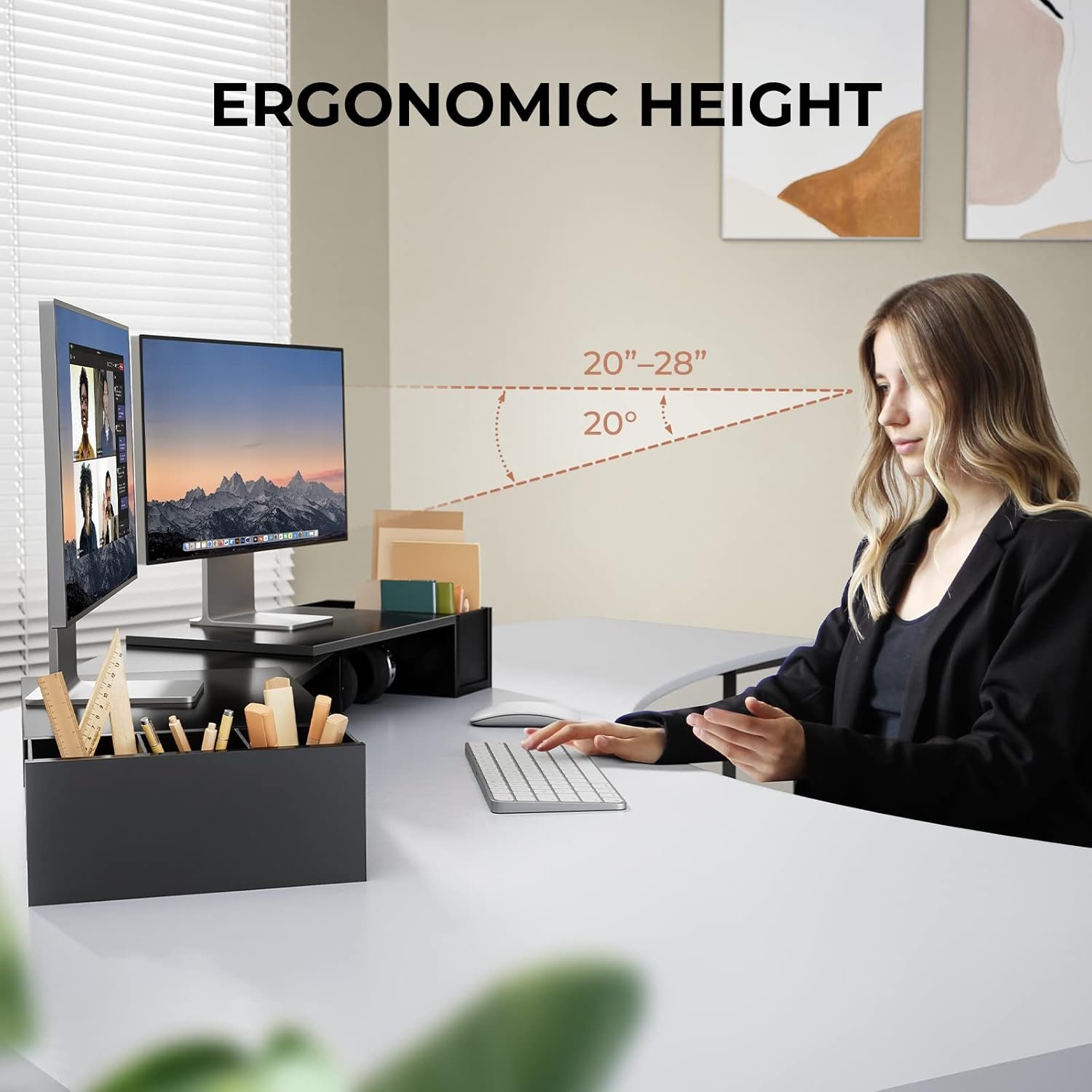 COMFORTABLE VIEWING HEIGHT: The design of the monitor riser for 2 monitors can raise the monitor to an ergonomic viewing angle, allowing you to keep a comfortable sitting posture and focus more on work with this desktop stand.