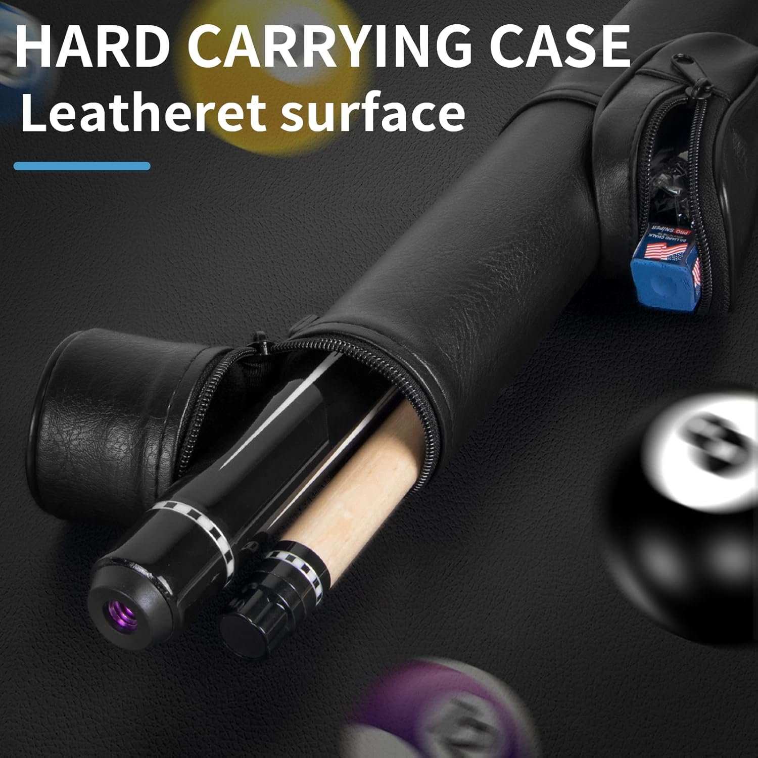 The pool cue set is equipped with Hard carrying case ,billirads gloves and chalks.Easy to take it anywhere ,all the accessories inclued will definitely promote your experience for billiards games.Please do not replace the front maple section and grip section with other brand because it might cause the cue to bend.Due to some reasons of produce process, the leather has peculiar smell inside the hard case.plese place it in window and ventilate it for a period of time to elimilate the smell.