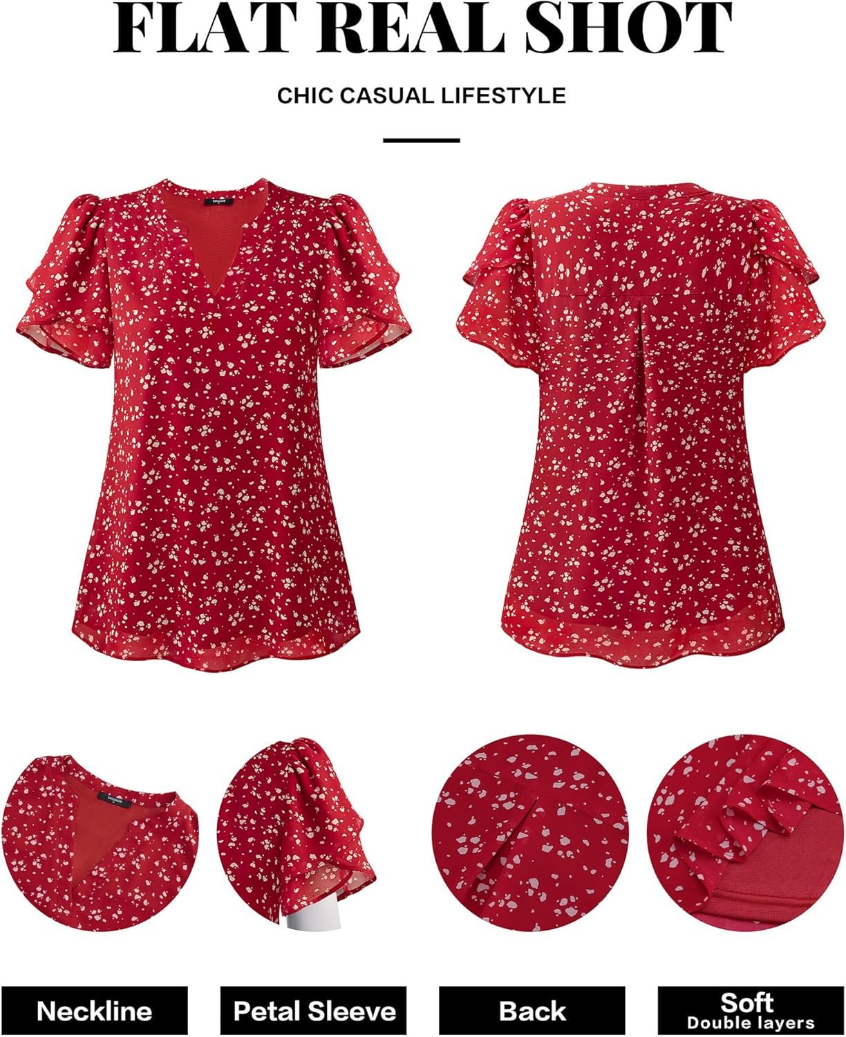 Lotusmile Womens Dressy Chiffon Blouses Summer Puff Petal Short Sleeve Shirts V Neck Casual Work Tops