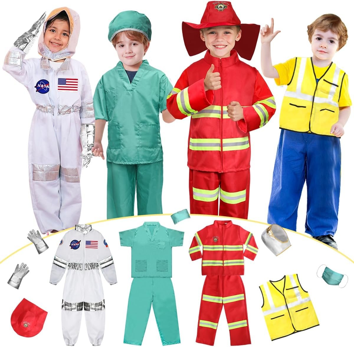 LOYO Kids Role Play Dress Up Clothes for 3-8 Years Old Play, 4 Sets Astronaut/Doctor/Fireman/Construction Costume for Kids And Toddlers Boys Halloween Costumes