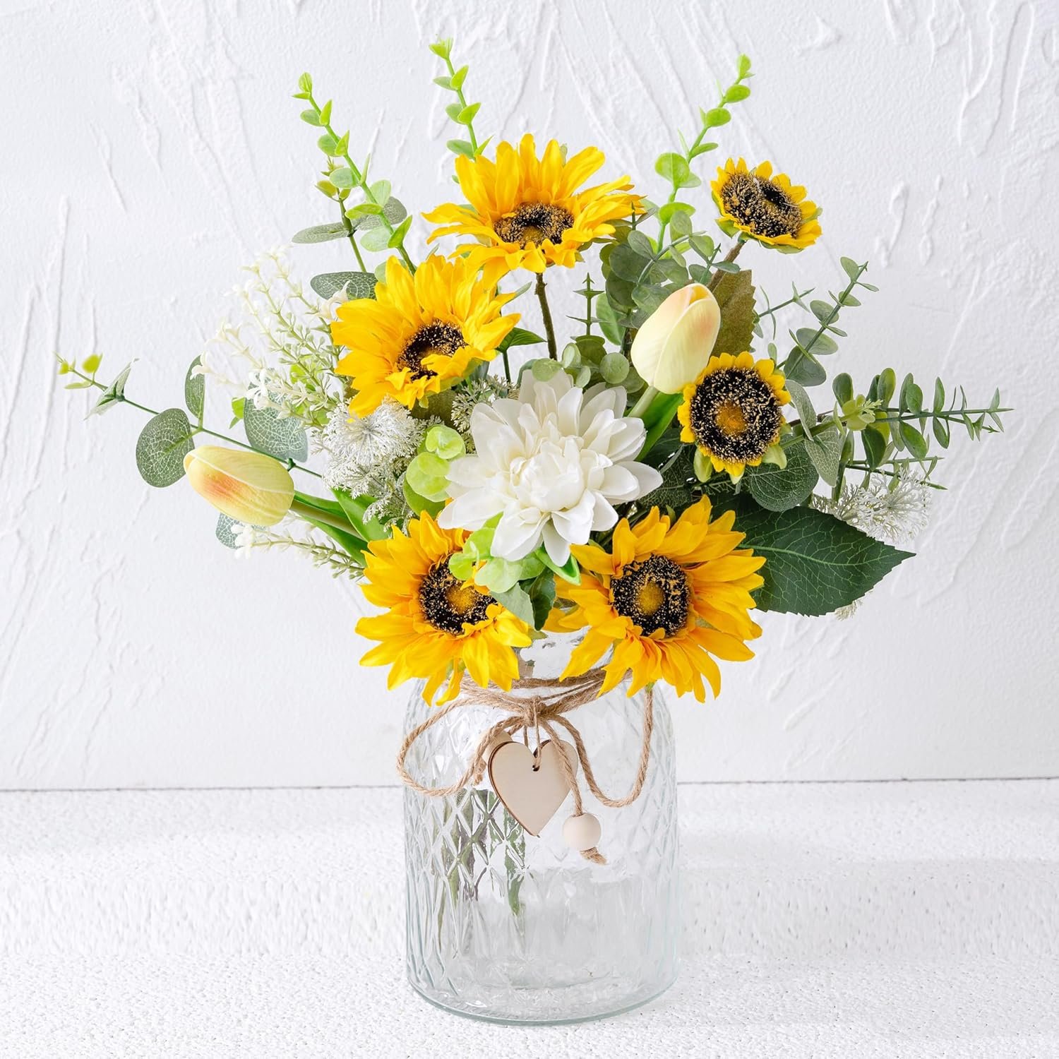 LUEUR Artificial Flowers in Vase-Sunflower and Yellow Tulips Faux Silk Flowers Plants for Home Office Decorations, Kitchen Dining Table Decor, Farmhouse Centerpiece Table Decoration