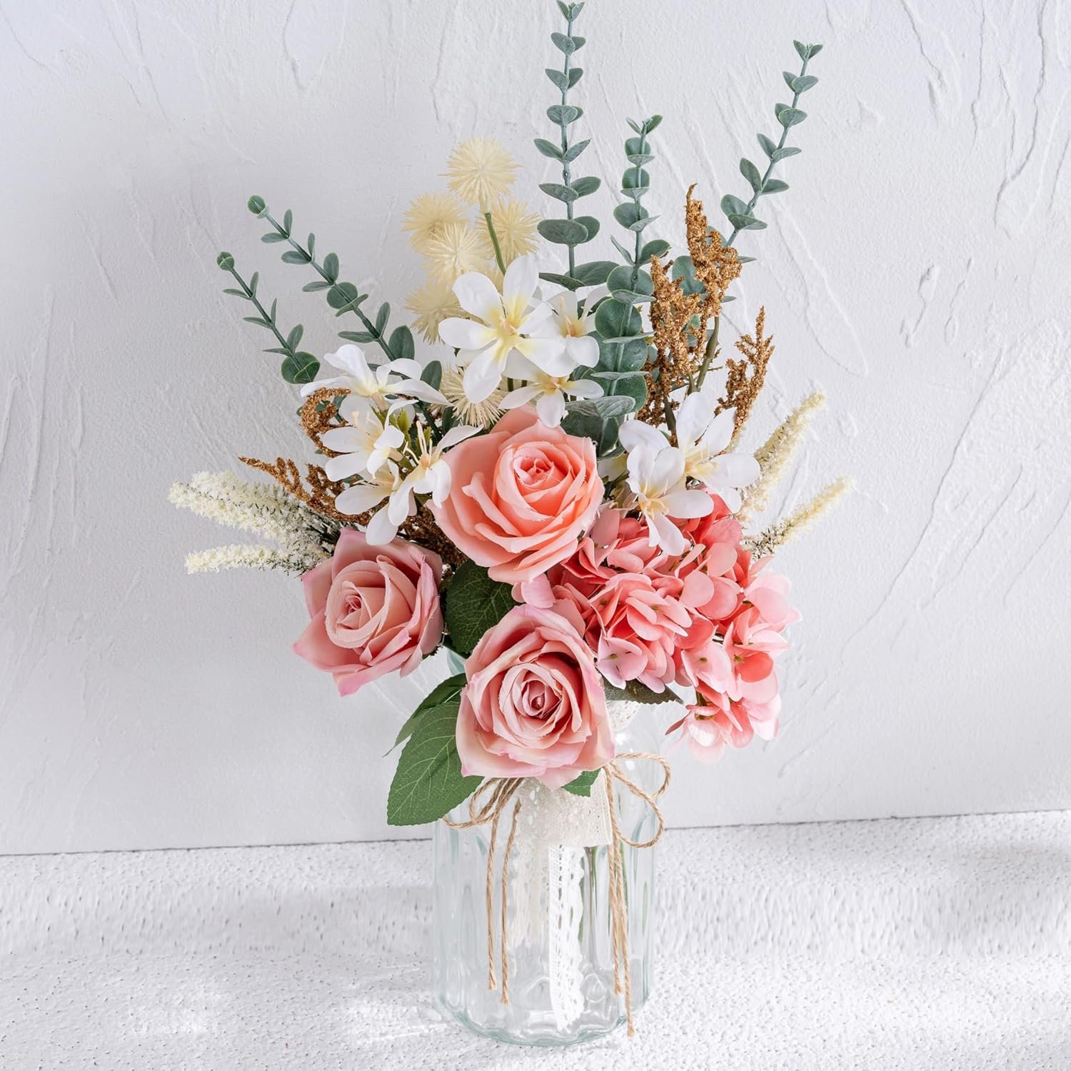 LUEUR Artificial Pink Flowers with Vase for Decoration Faux Rose Flowers in Vase Realistic Pink Fake Hydrangea Flowers for Home Spring Decor Indoor Dining Coffee Table Centerpiece