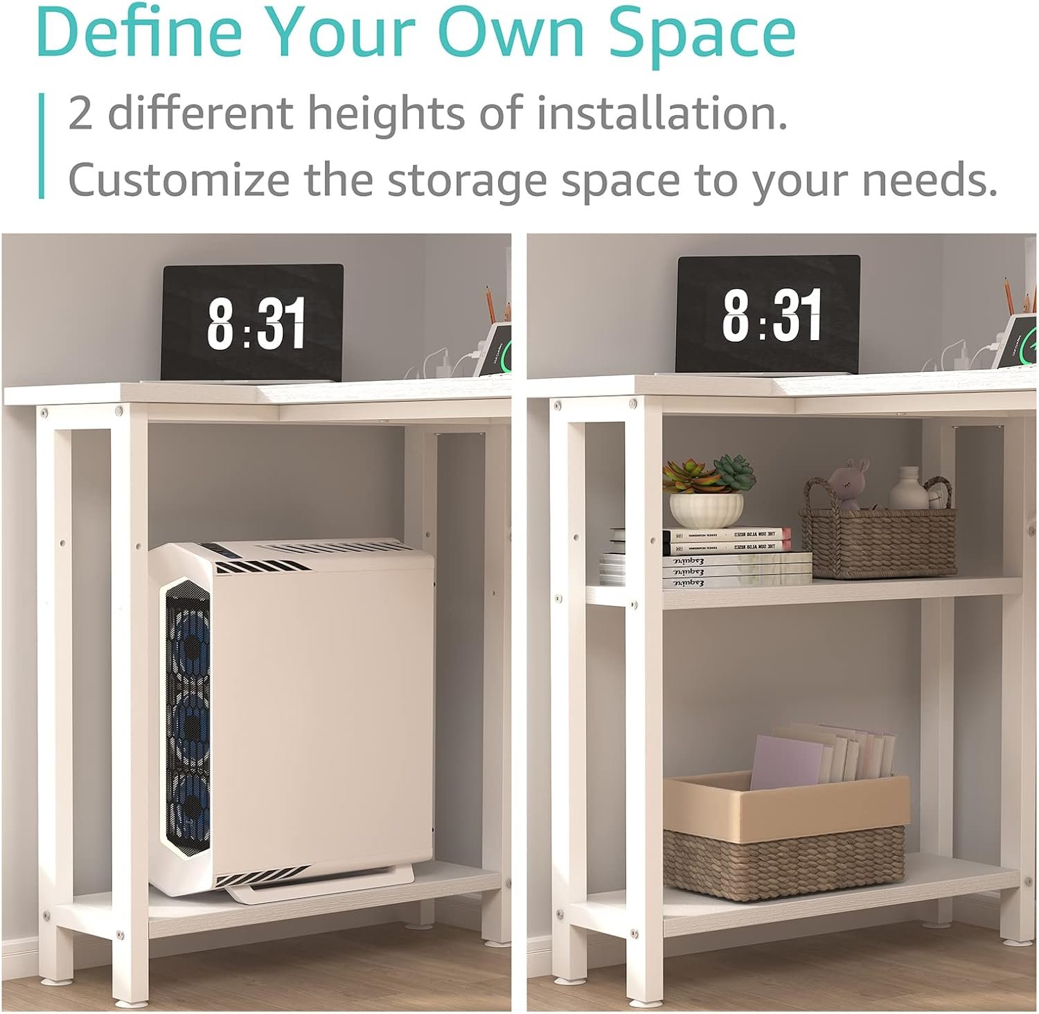 Modern Simple Style Design: Computer desk with 2 storage shelves, you can try this two installation methods (left or right), and have two different heights of installation, you can customize the storage space to your needs. This splice board desk is made of thick P2 particle wood board with scratch-resistant, anti-collision and waterproof, protect home office desk surface from daily wear and tear.