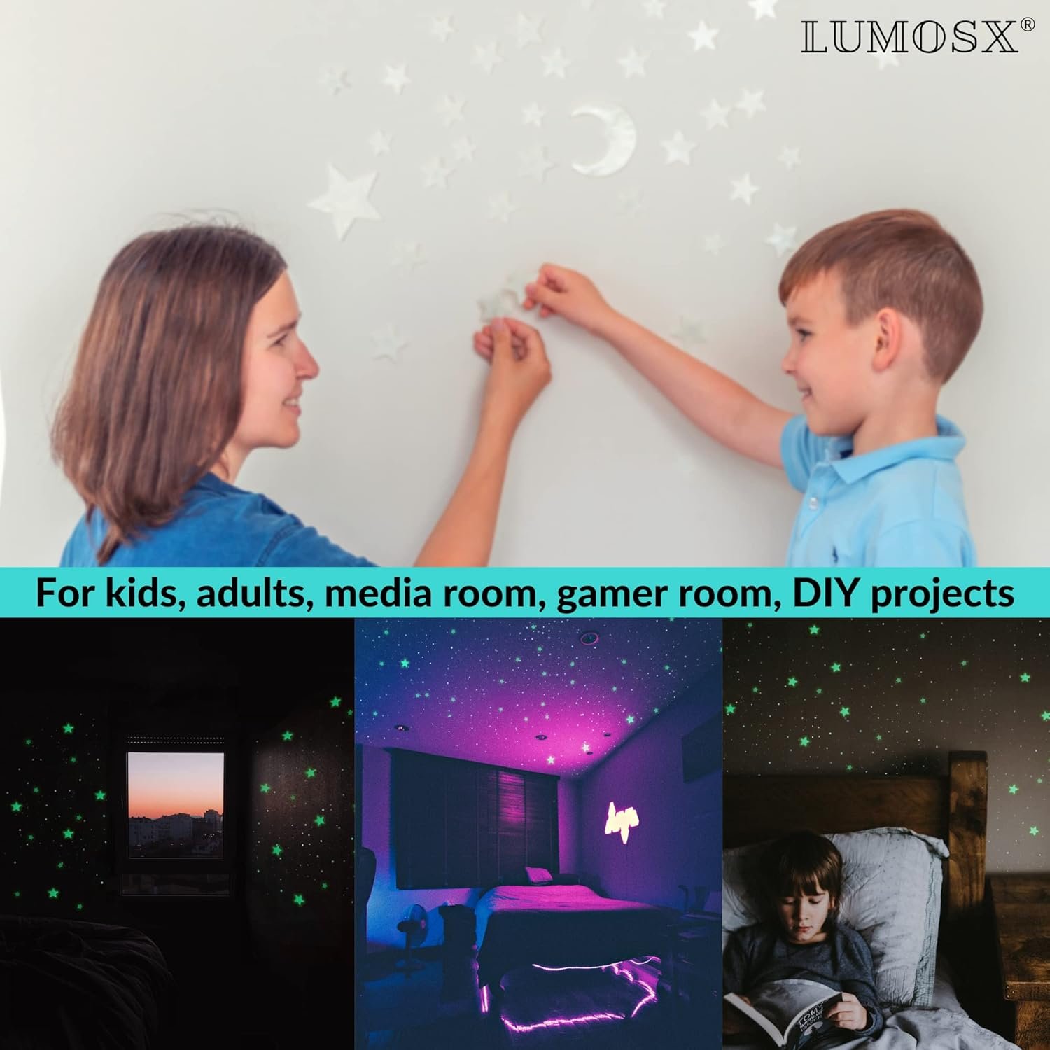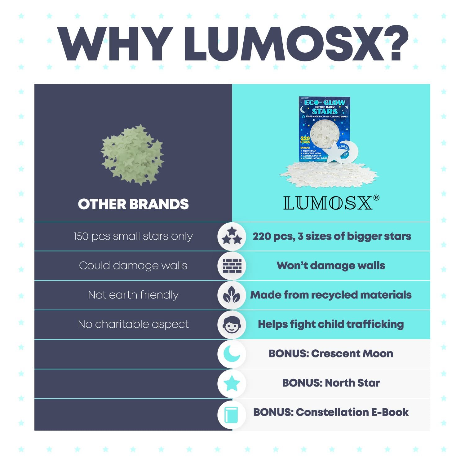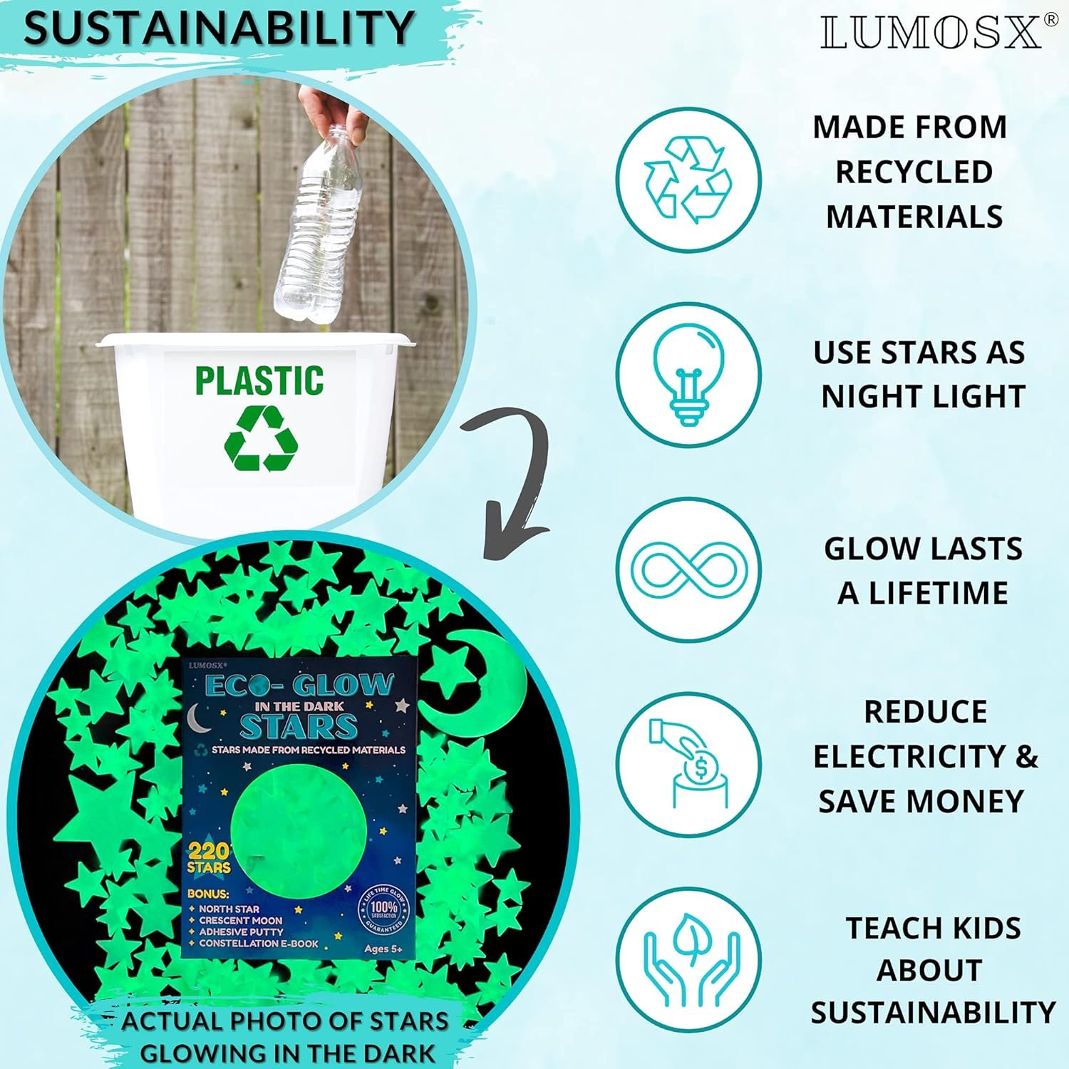 LUMOSX Glow in the Dark Stars for Ceiling – 220pcs Recycled Material Stars with North Star, Moon & Constellation E-Book for Kids’ Room Decor