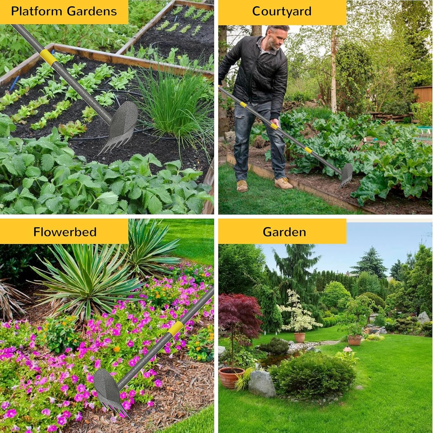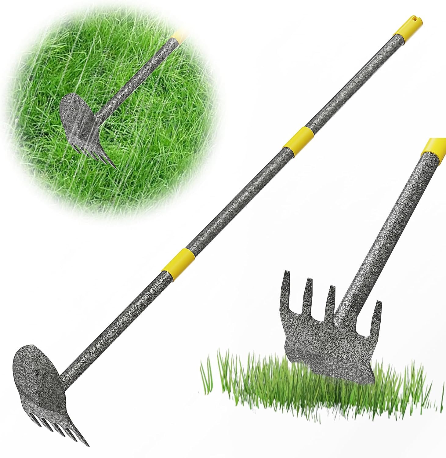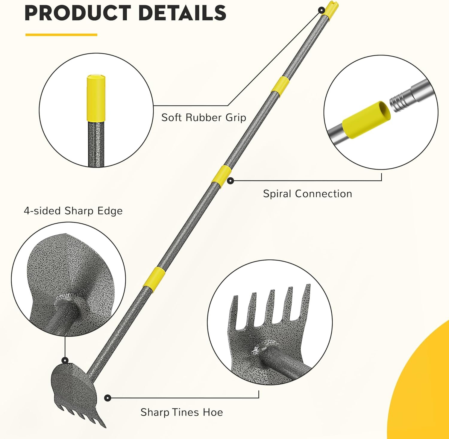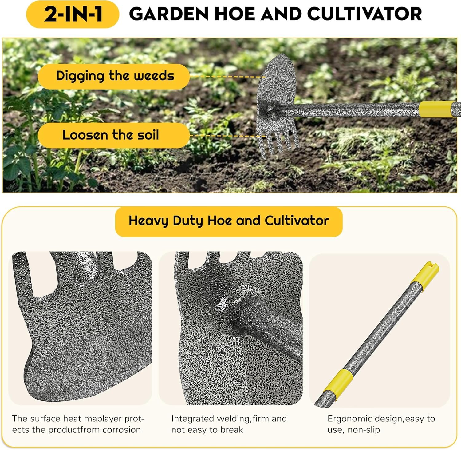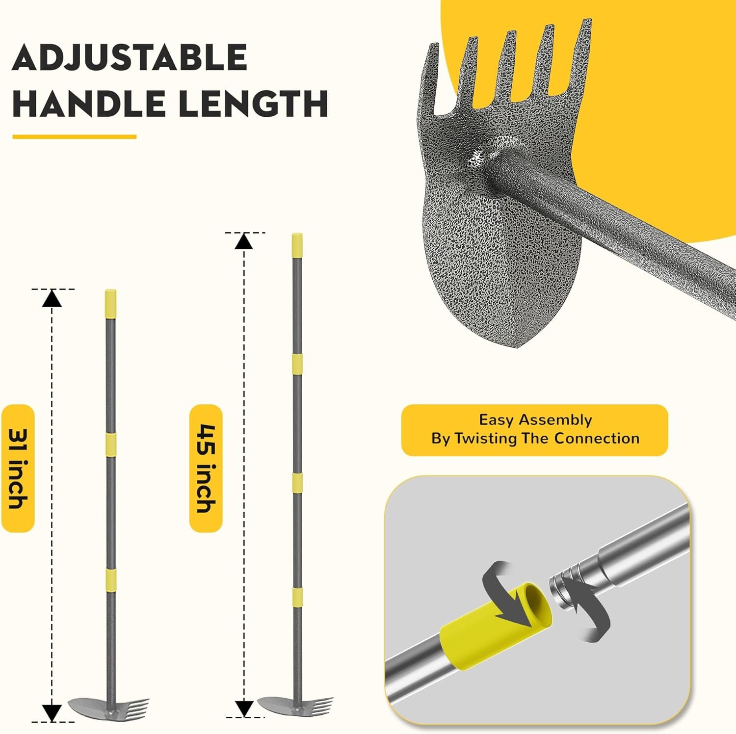 【Adjustable Length for Comfort and Efficiency】The Garden Hoe Long Handle features a multi-rod design connected by a threaded interface. You can easily adjust the length to suit your height, reducing back strain and making gardening more comfortable. Advanced welding technology ensures a strong bond between the pole and the hoe, so the Garden Hoe remains securely attached during use.