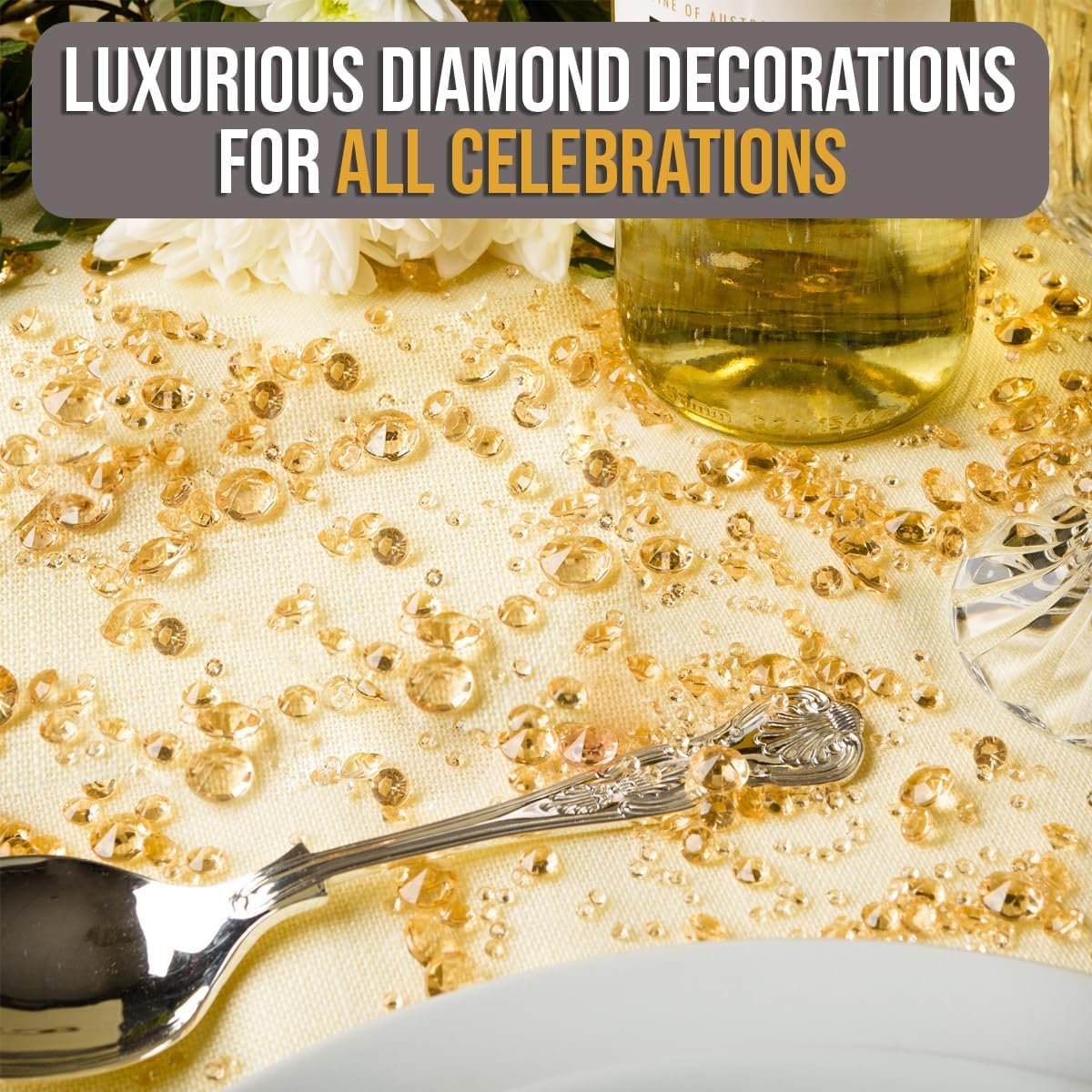 EASY & HASSLE-FREE DECORATIONS. Diamond table confetti is a quick and simple way to set an enchantine, sophiticated tone for your wedding reception or party, transforming your party decor in seconds just by sprinkling the gems onto the party tables and wedding centerpiece table decorations so you can plan ahead and relax. After the party, use these exquisite golden diamond table decorations tin your home in vases, bowls or containers adding a touch of warmth and glamour to any room.