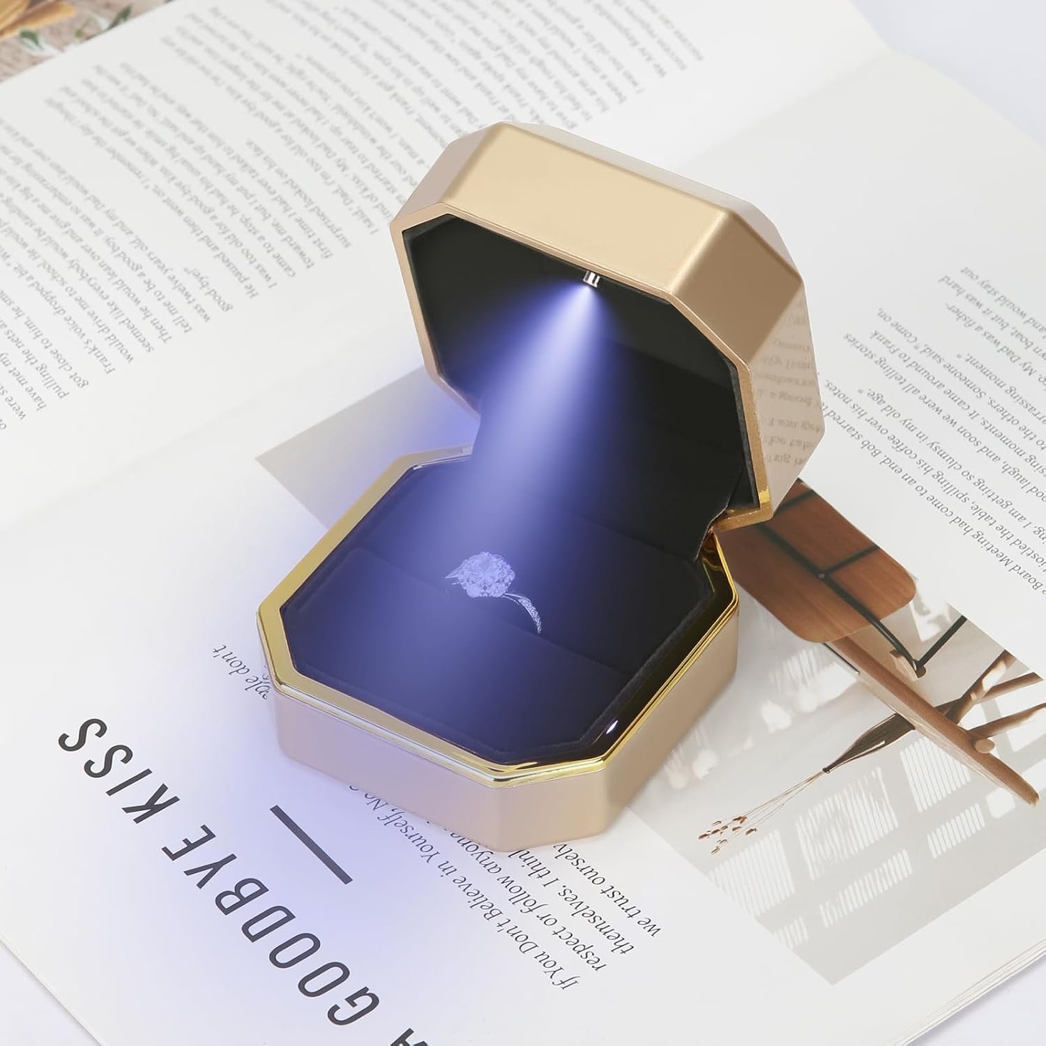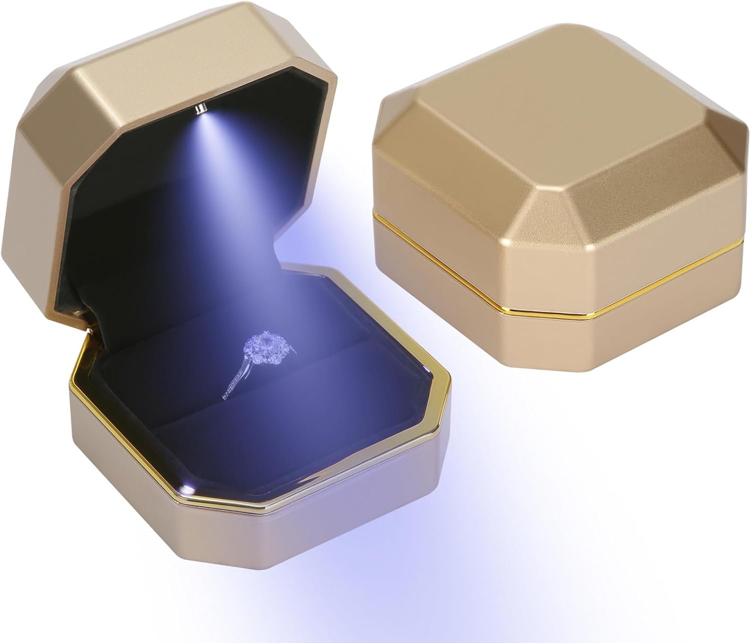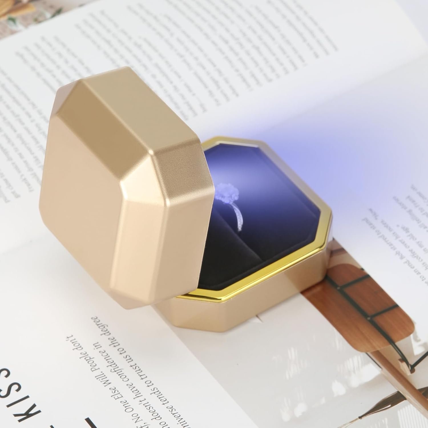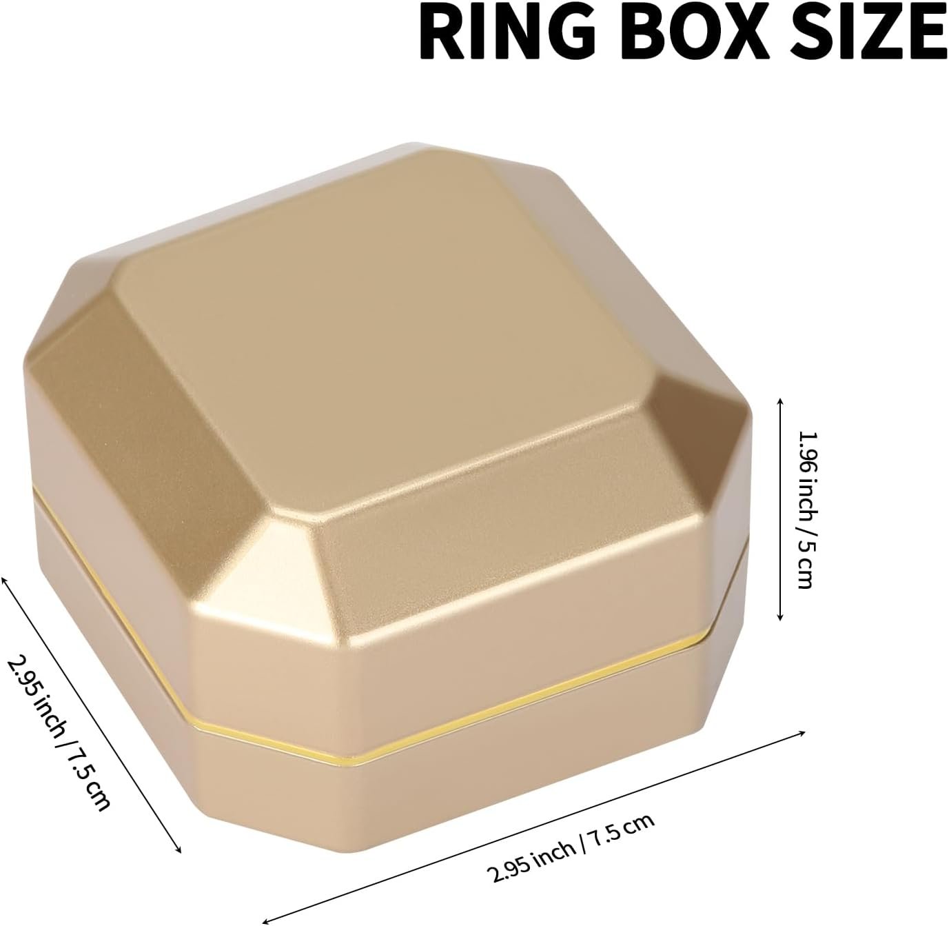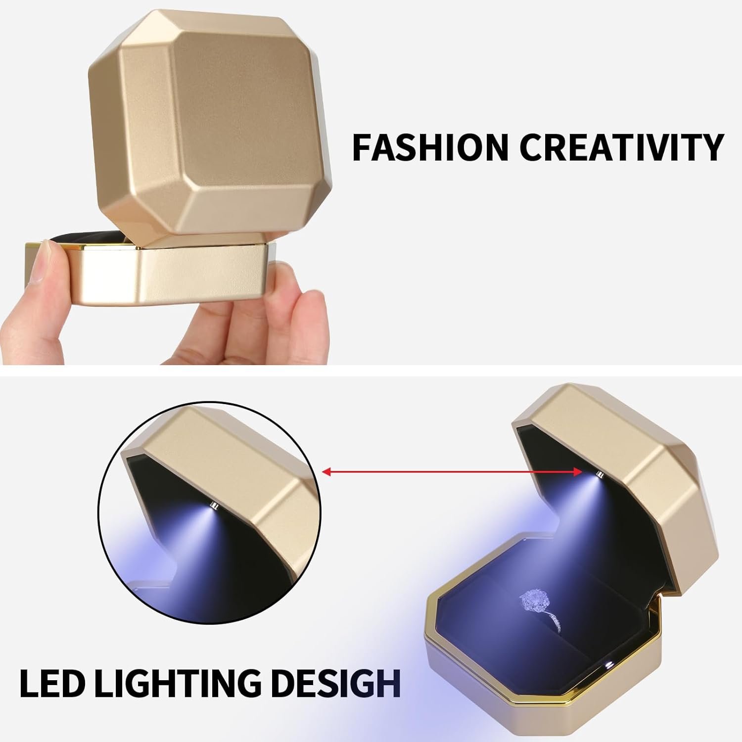 Luxury LED Jewelry Ring Box, Velvet Ring Gift Box Storage Case Organizer Holder for Proposal Engagement Wedding Anniversary Birthday Ceremony (Gold)