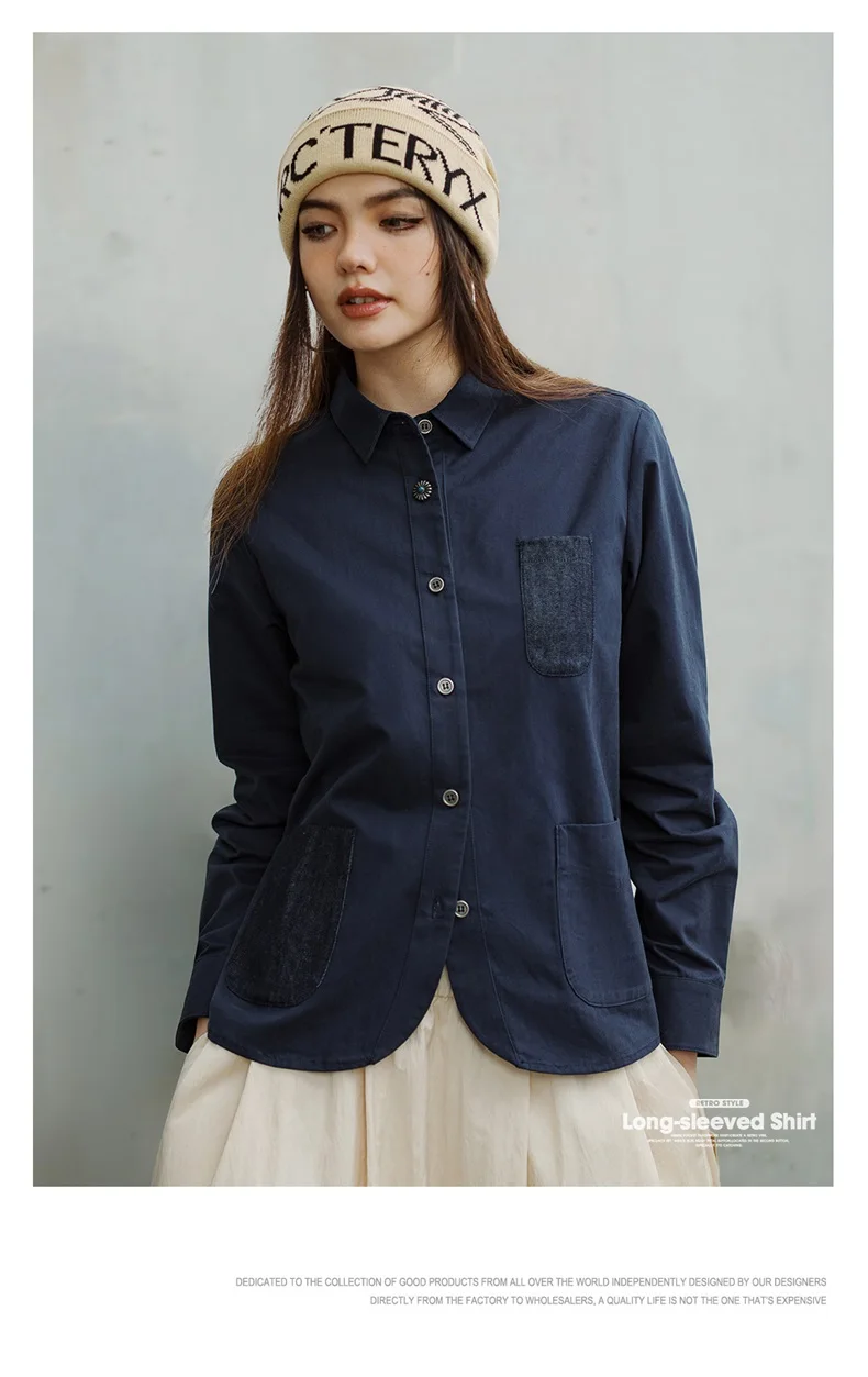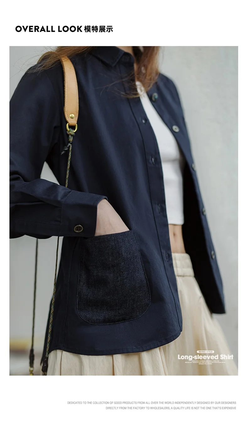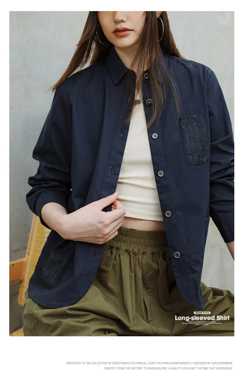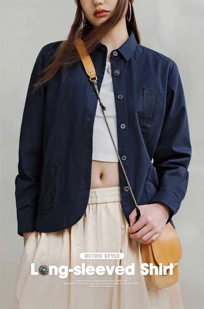 Maden Denim Pocket Patchwork Shirt for Women Long-sleeved Casual Jacket Navy Blue Cotton Shirt Fall Blouses Streetwear Tops
