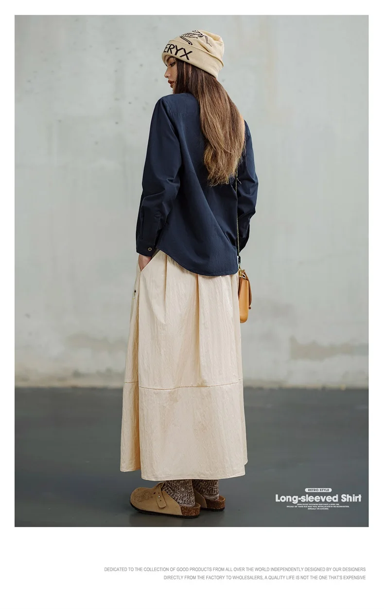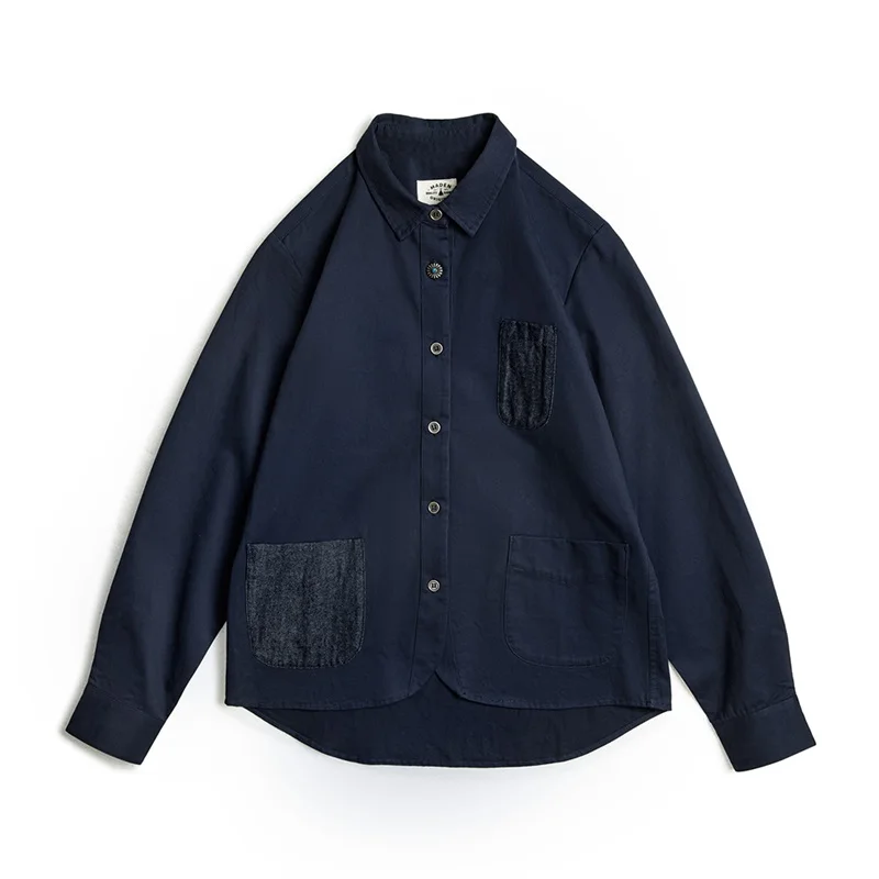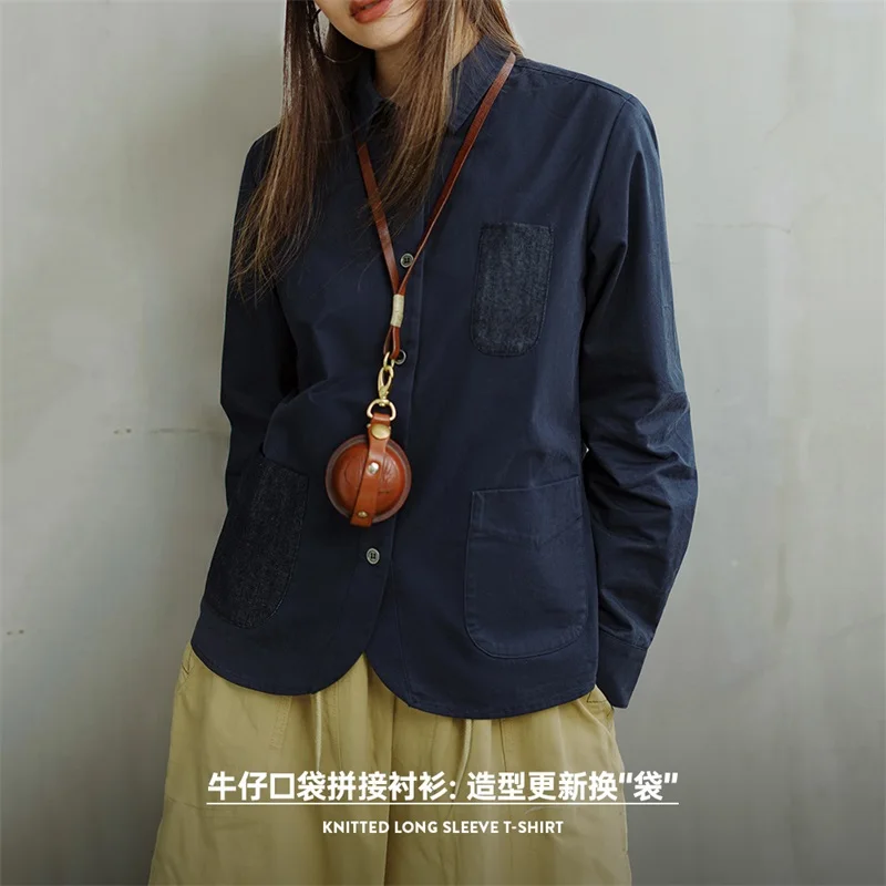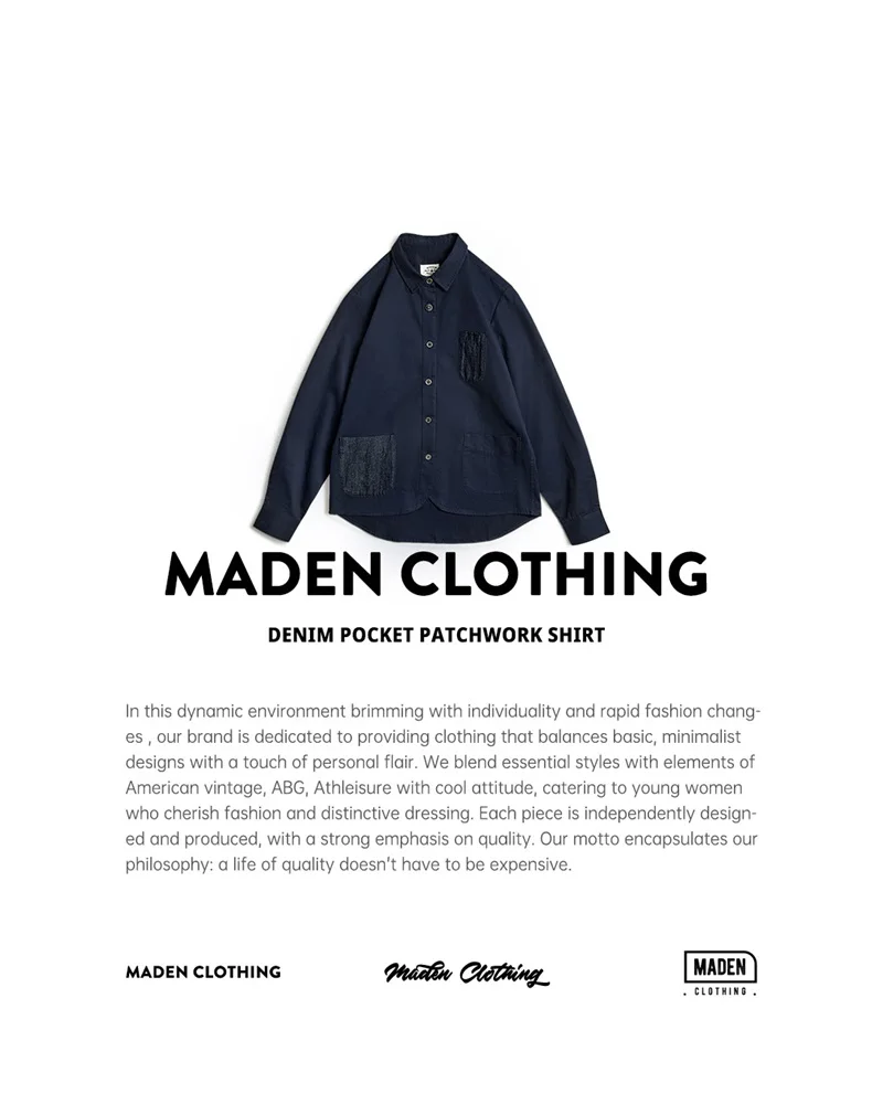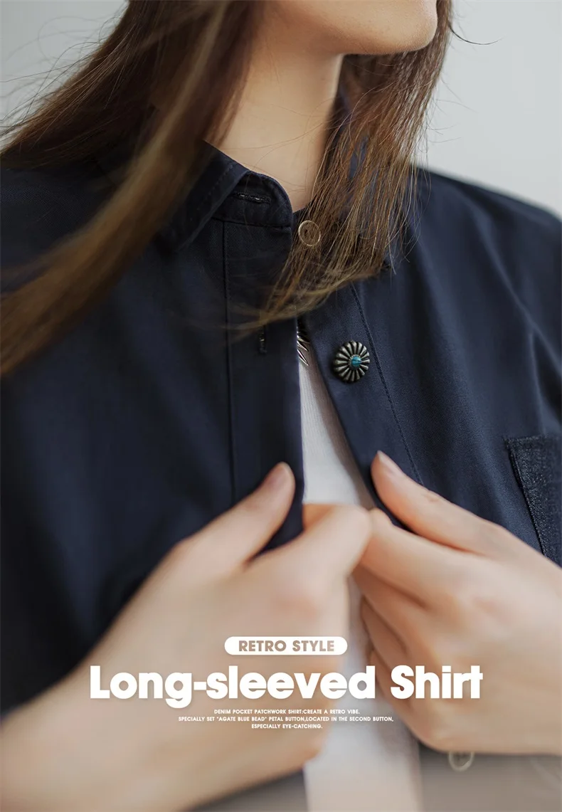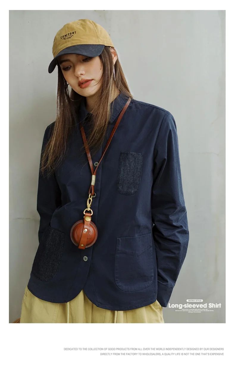 Maden Denim Pocket Patchwork Shirt for Women Long-sleeved Casual Jacket Navy Blue Cotton Shirt Fall Blouses Streetwear Tops