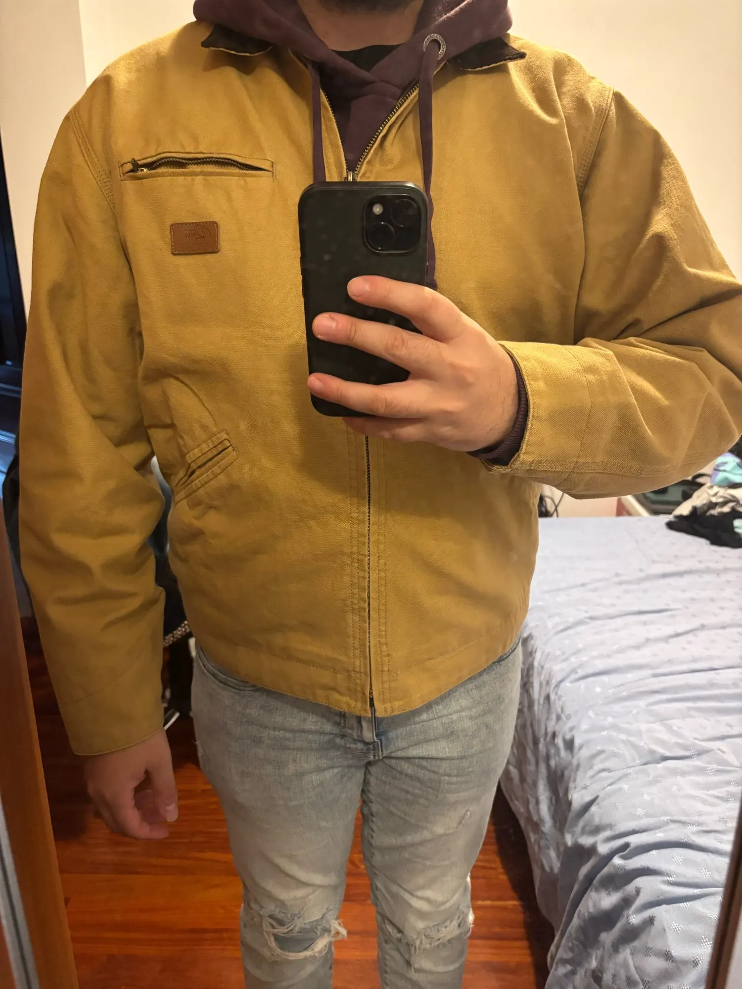 The jacket is excellent: fabric, stitching, and accessories. The style is loose, does not restrict movement. There are not enough internal pockets. The smartphone does not fit into any of the outer pockets.