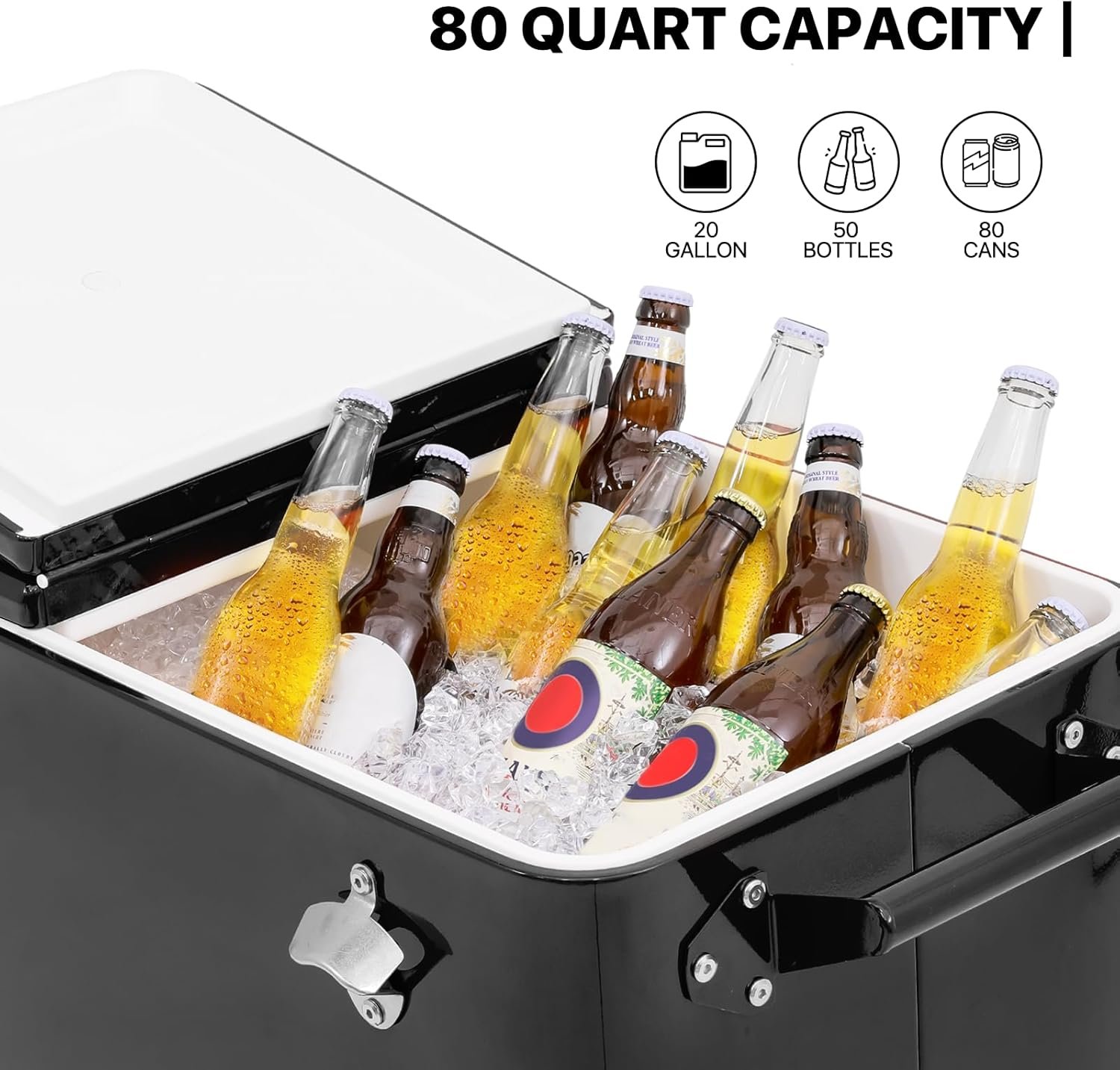 Large 80-Quart Capacity – Our patio rolling cooler offers plenty of space to store up to 110 12-oz cans or 50 bottles plus extra room for ice. Ideal for large parties and outdoor or indoor activities, such as dinner parties, BBQ, or pool parties.