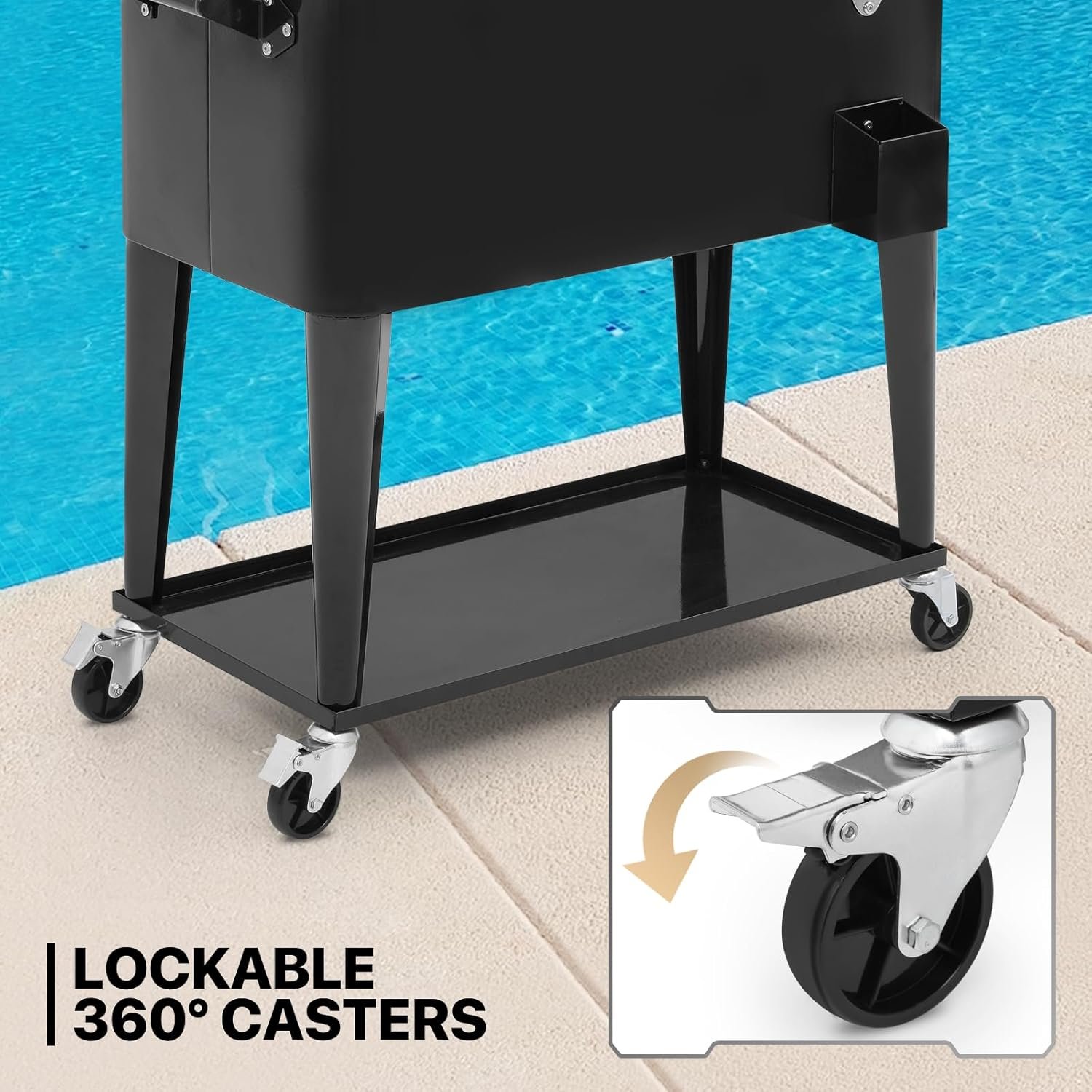 Convenient & Portable – This outdoor rolling cooler comes with 4 heavy-duty caster wheels and metal side handles to make it simple and easy to move the patio cooler as needed. Two of the casters can be secured in a lock position for stability when needed.