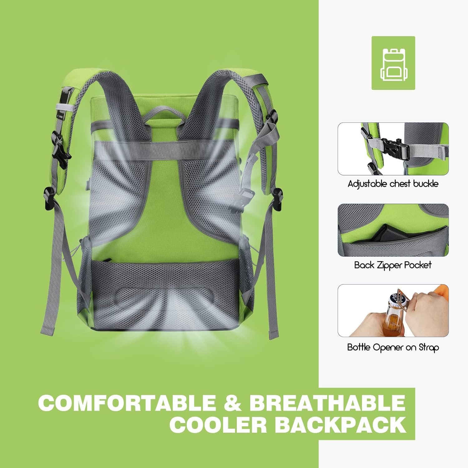 Ergonomic & Comfortable Design: Thicker padded back with ergonomic breathable design paired with adjustable,breathable and padded S shoulder straps help to reduce fatigue during a long day of trip. The backpack ice chest comes with a handle,which is labor-saving and durable. The adjustable chest buckle works perfectly to distribute the pack’s weight and keep it steady and centered. And chest buckle designed as a survival whistle for quick and easy use in case of emergency.