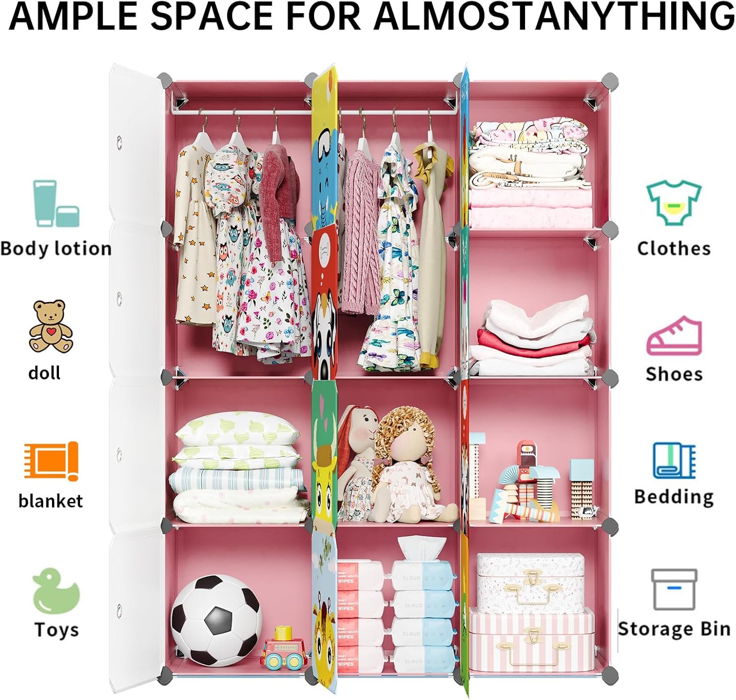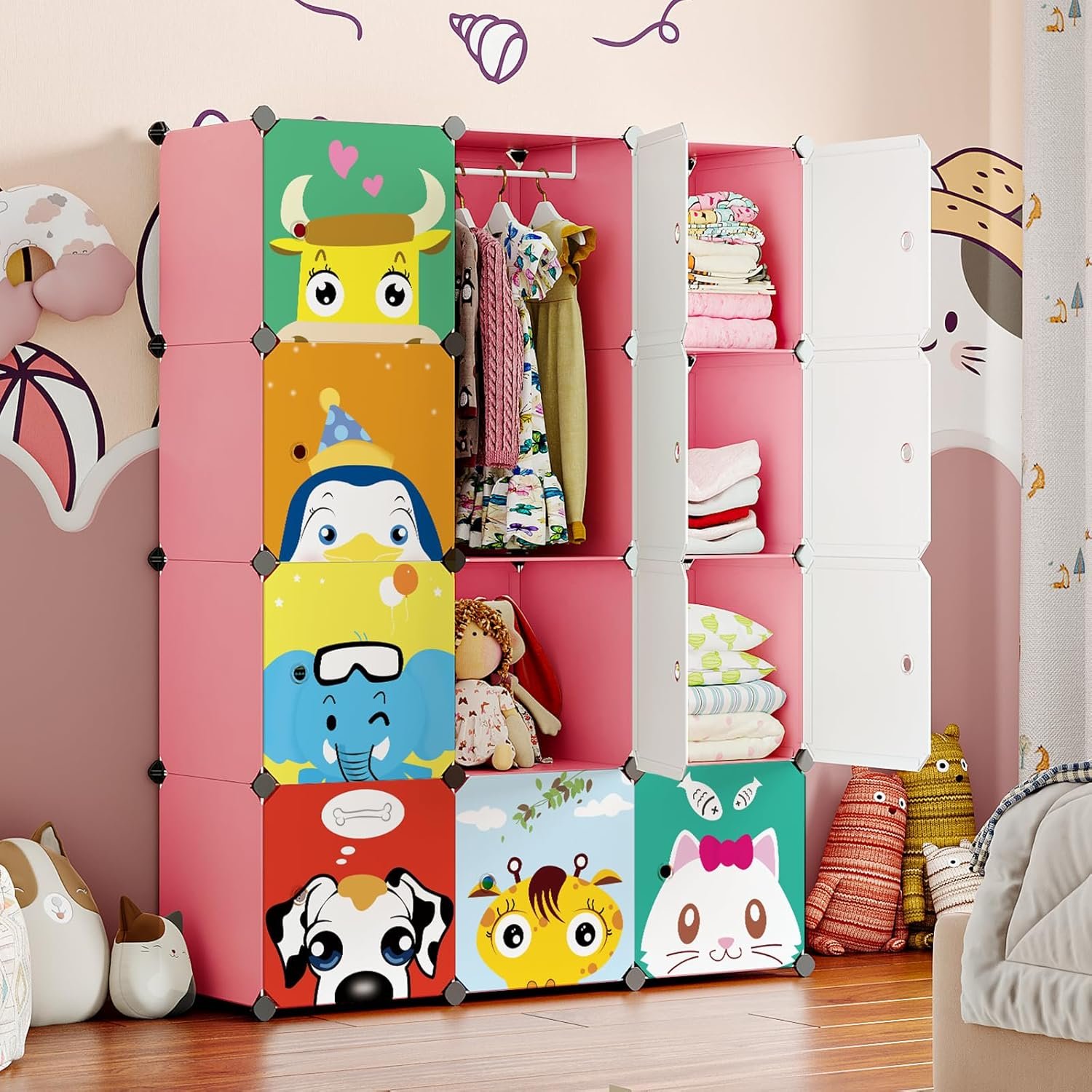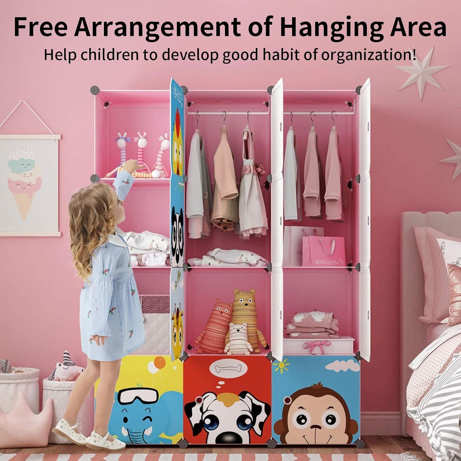 MAGINELS Children Wardrobe Kid Dresser Cute Baby Portable Closet Bedroom Armoire Clothes Hanging Storage Rack Cube Organizer,(Pink, 8 Cube & 2 Rod)