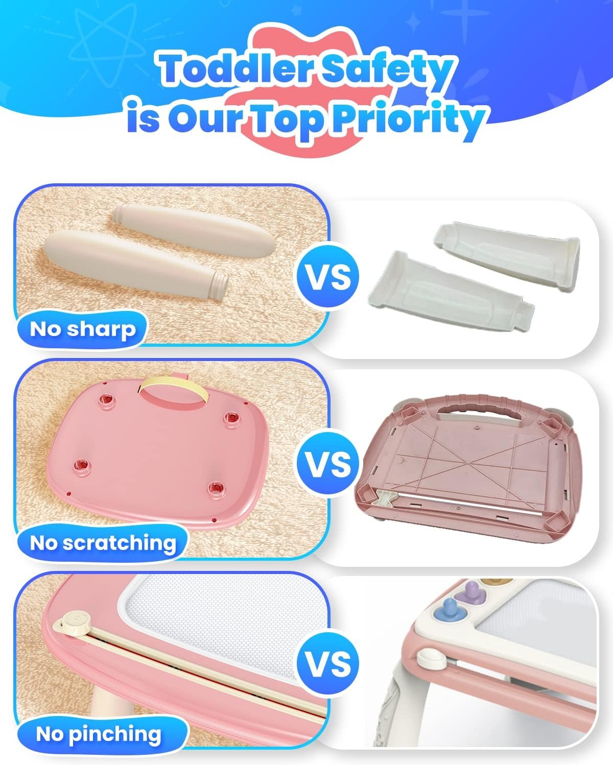 Safe and Eco-friendly Toy: Our drawing board made of non-toxic, BPA-free, eco-friendly ABS plastic material, is a clean and eco-friendly way to satisfy your child’s drawing. The eraser knob glides easily and smoothly for kids. Erases in a second for a clean drawing area for new drawings. and won’t hurt your kids’ delicate hands. Our mom can put our baby in high chair with the drawing board and it keeps him busy & happy while you clean or cook. Complete peace of mind to let children play alone.