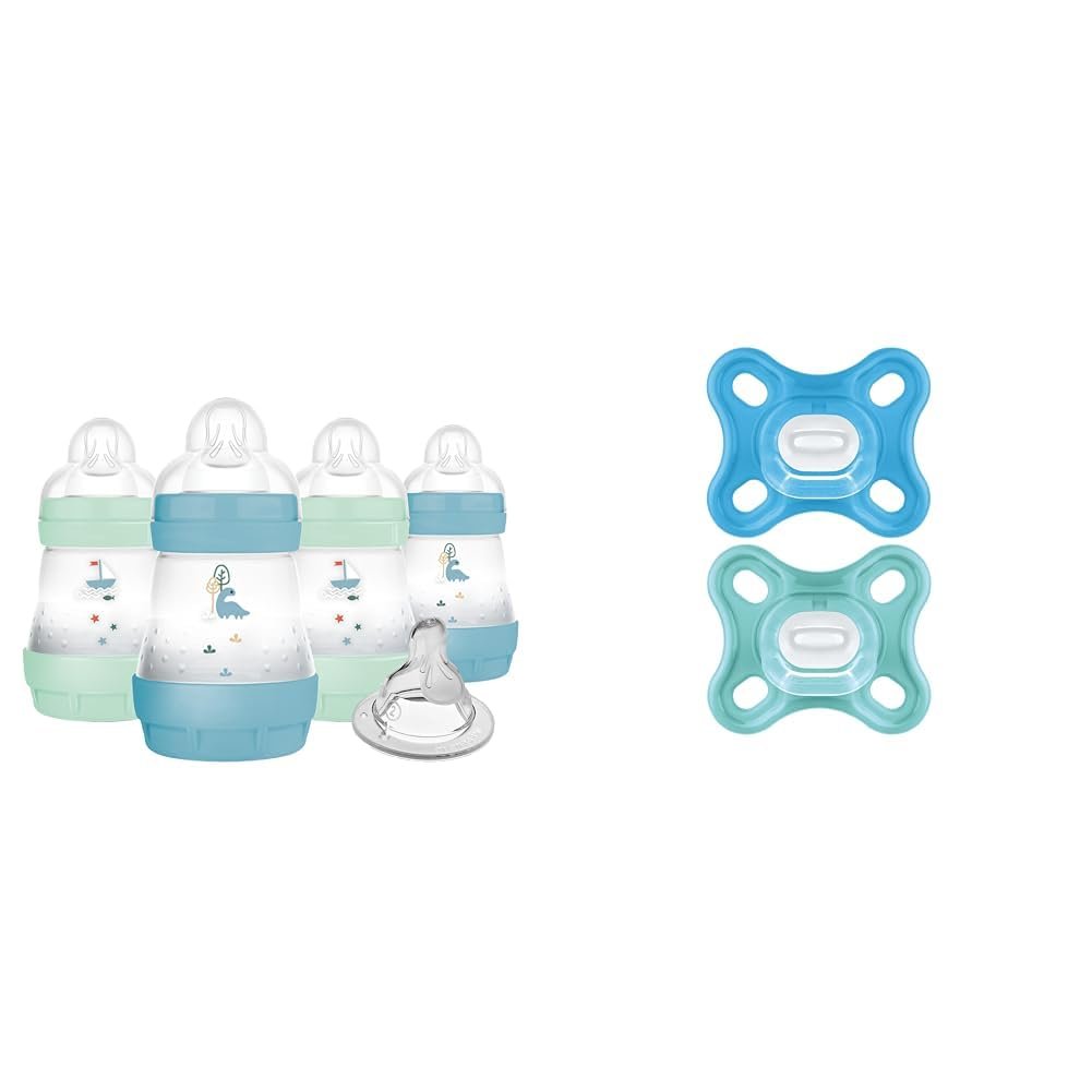 MAM Anti-Colic Baby Bottles, Slow Flow Nipple, Newborn Pacifiers, Sterilizer Case, 0-3 Months (5oz Bottle 4 Pack + Pacifier 2 Pack)