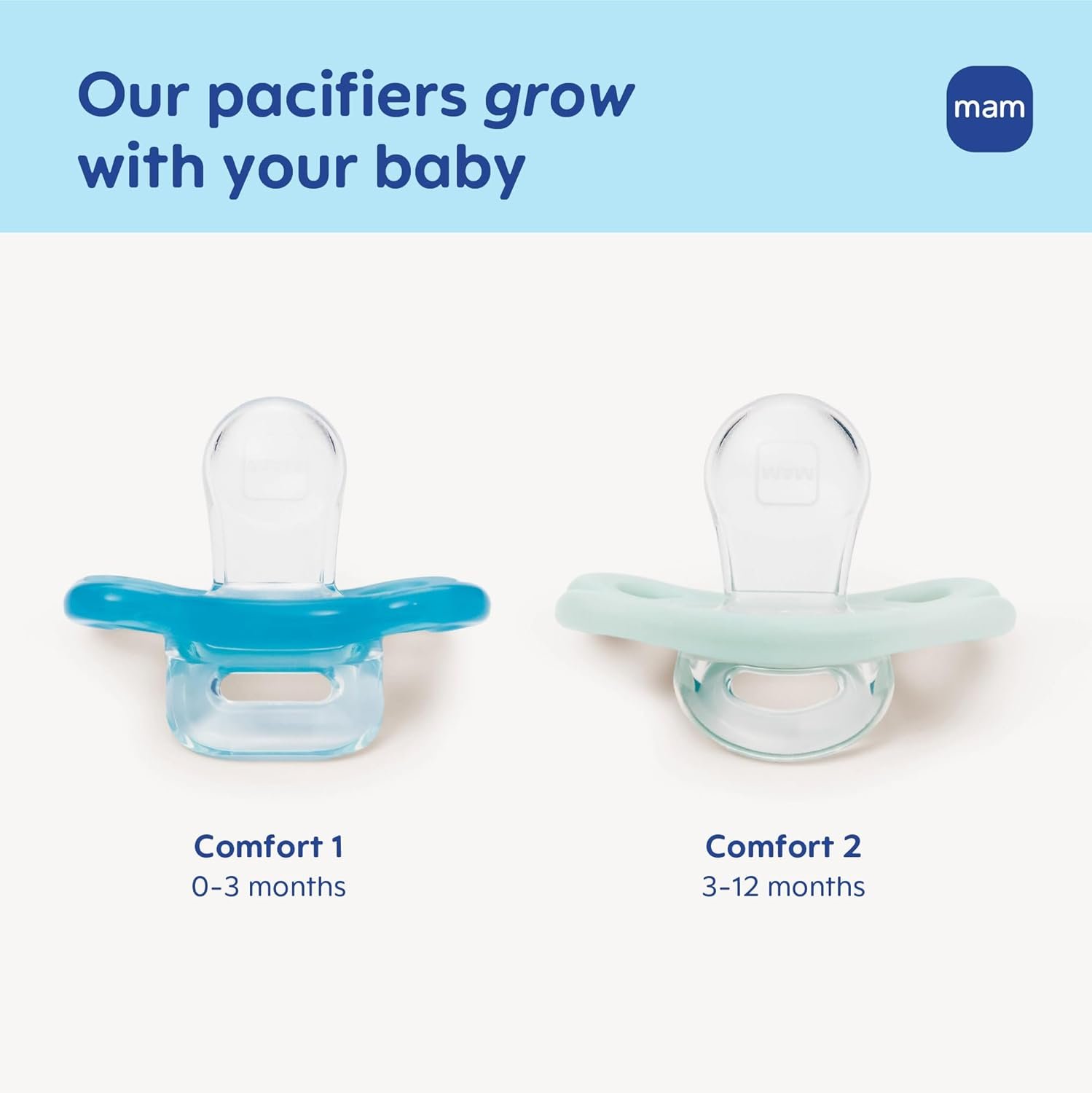 MAM Comfort newborn pacifiers have a one-piece construction made of full silicone, and are on average 36% lighter* than other competitive one-piece pacifiers for breastfed babies. The lightweight design and extra small nipple is very well-accepted by babies and is optimally adapted to the special needs of newborn boys and girls. The extra soft shield has four large air holes to ensure baby’s sensitive skin stays dry and comfortable, while the unique MAM shape leaves plenty of room for baby’s nose to breathe. The convenient handle is great for attaching a clip to keep baby’s silicone pacifier always in reach. *Scientific reports from the WILD Hi-Precision Institute (Austria) confirm that the MAM Comfort is 36% lighter than the average weight of all other tested one-piece silicone pacifiers. Measured weight results: 8.2 g – 18.6 g