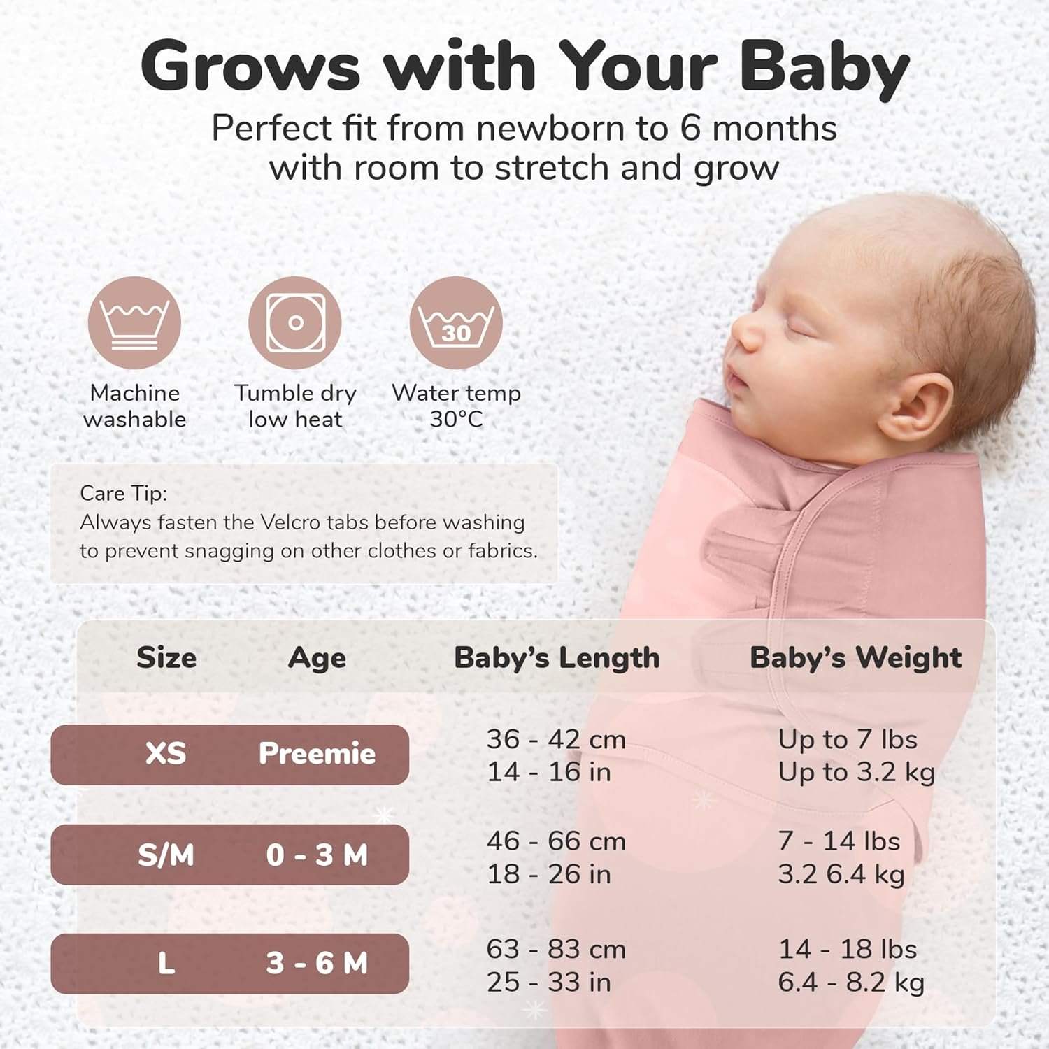 Our swaddles come in 3 different sizes — XS preemie swaddle wraps for premature babies weighing up to 7 lbs, Small/Medium swaddles for 0-3 month newborns weighting 7-14 lbs, & our large-sized baby sleep sack swaddles 3-6 months for 14-18 lbs infants.
