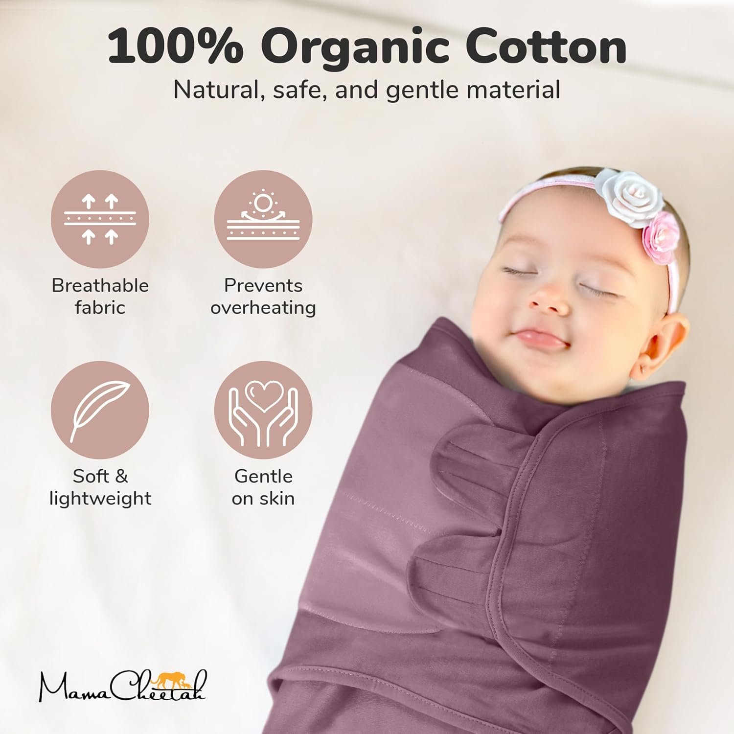 The Mama Cheetah Adjustable Swaddles are just what you’ve been looking for. Our swaddle wraps are made of super soft, lightweight and breathable 100% organic cotton to keep your newborn perfectly wrapped and cozy. The lightweight fabric prevents overheating and keeps your newborn comfortable. We took special care to ensure that your baby could be swaddled in a premium natural cotton fabric so they can sleep soundly and peacefully.