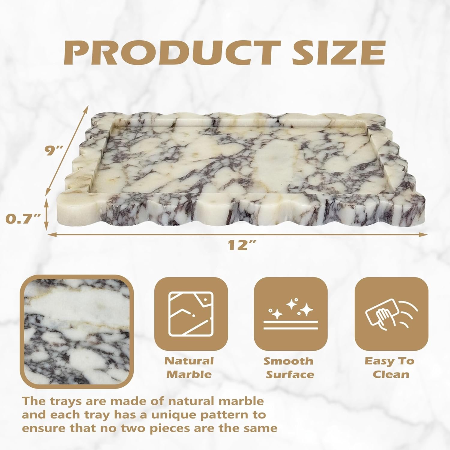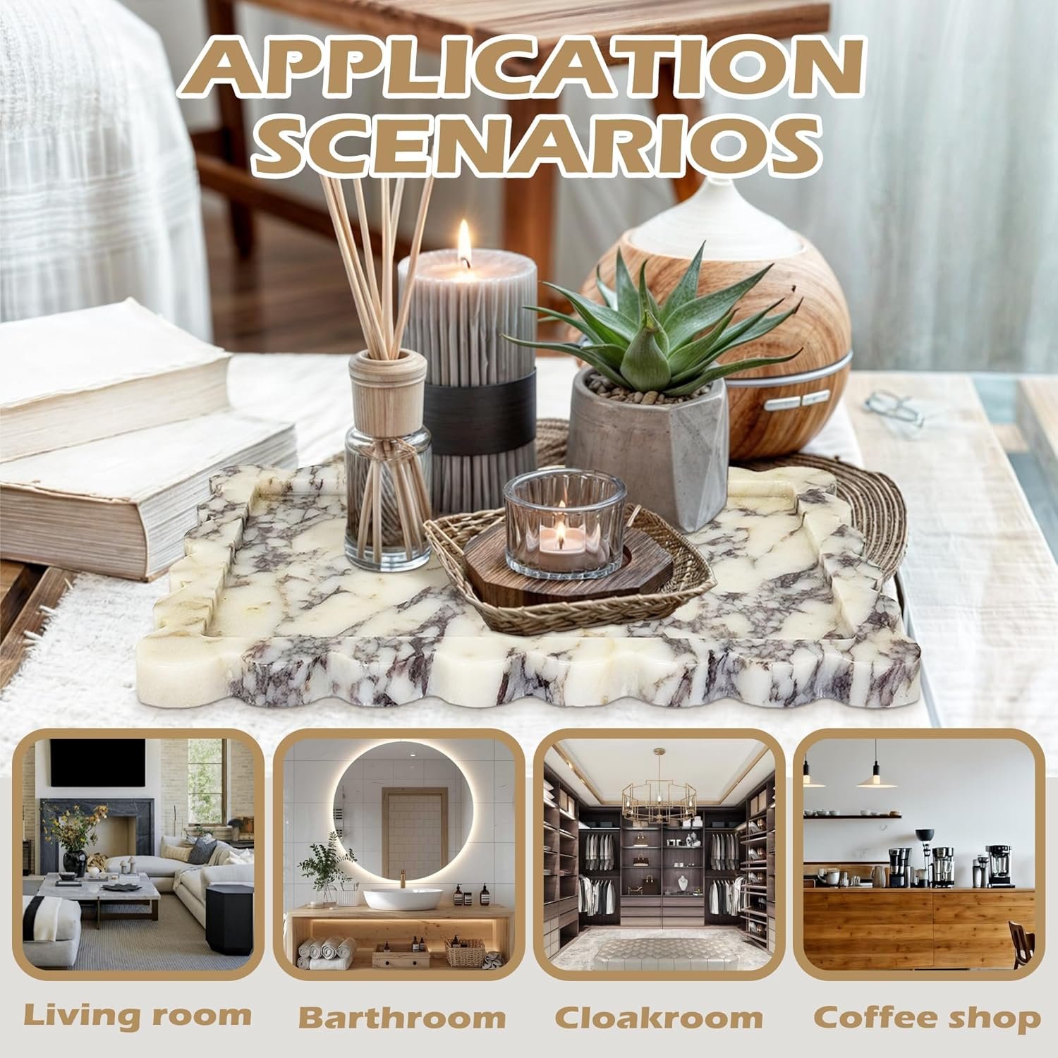 【Versatile Design for Multiple Uses】Measuring 12 x 9 x 0.7 inches, this marble tray is perfect for a variety of functions. Use it to display jewelry, candles, and perfumes on your vanity, organize spices or serve appetizers in the kitchen, or showcase decorative items like candles and plants in the living room. It’s also ideal for keeping bath essentials neatly arranged in the bathroom or adding a sophisticated touch to your office space.