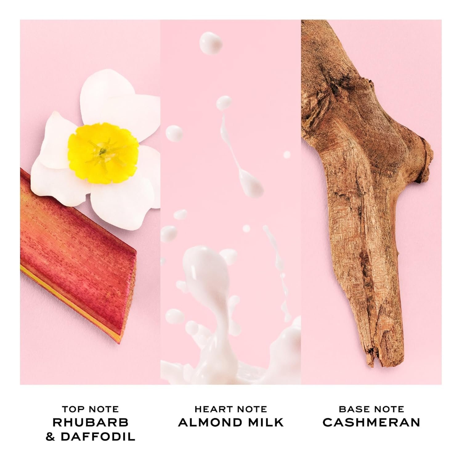 Top Notes: Rhubarb and Daffodil; Heart Notes: Almond milk; Base Notes: Cashmeran