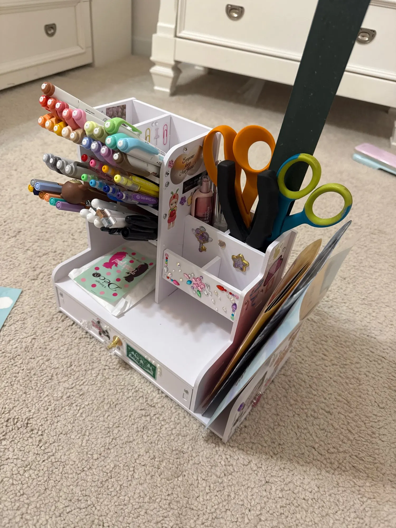 Great!! Came within a week along with other stuff i ordered, and wasn’t damaged at all. It was super easy to put together and came with the screws and a mini screwdriver so you don’t need to worry about anything. It’s not made of wood so you would have to be gentle and careful to not scratch it or dent it since it dents easily, but other than that it’s perfect and is holding all of my supplies well. It also looks so freaking cute 😛