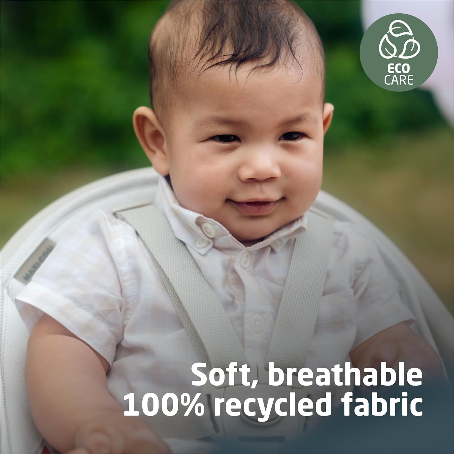 The Maxi-Cosi Moa 8-in-1 Highchair is an essential baby product designed to adapt as your child grows. This highchair for baby starts as an infant highchair and transitions into a toddler high chair for dining table use, accommodating your little one from 6 months up to 50 lbs. With eight different configurations, the Moa effortlessly converts from a highchair to a booster seat, a toddler stool, and even a desk with a seat, making it one of the most versatile baby highchairs available. For parents looking for highchairs for babies and toddlers, the Moa is designed using premium, future-friendly, 100%-recycled fabric made from plastic bottles. The high-quality yarn produced is soft, comfortable, and breathable—perfect for your little one. It’s easy to keep your baby to toddler highchair and dining area spotless. Moa’s cleanup is a breeze with the water-repellent, machine-washable inlay, washable 5-point harness, and dishwasher-safe tray. Designed for functionality and aesthetics, the Moa highchair eliminates hidden crevices where food can get stuck. No screws or extra tools are needed for assembly, allowing easy transformation to suit your growing child’s needs. The Moa highchair is undoubtedly a baby essential that grows with your child, providing a long-term value multifunctional solution.