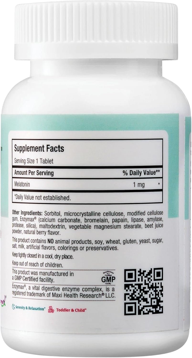 Maxi Health Melatonin 1mg Chewable – Sleep aid Melatonin to Encourage Natural Sleep – Non-Habit Forming Supplement with Enzymax for Fast-Acting Support Kosher (200 Units)