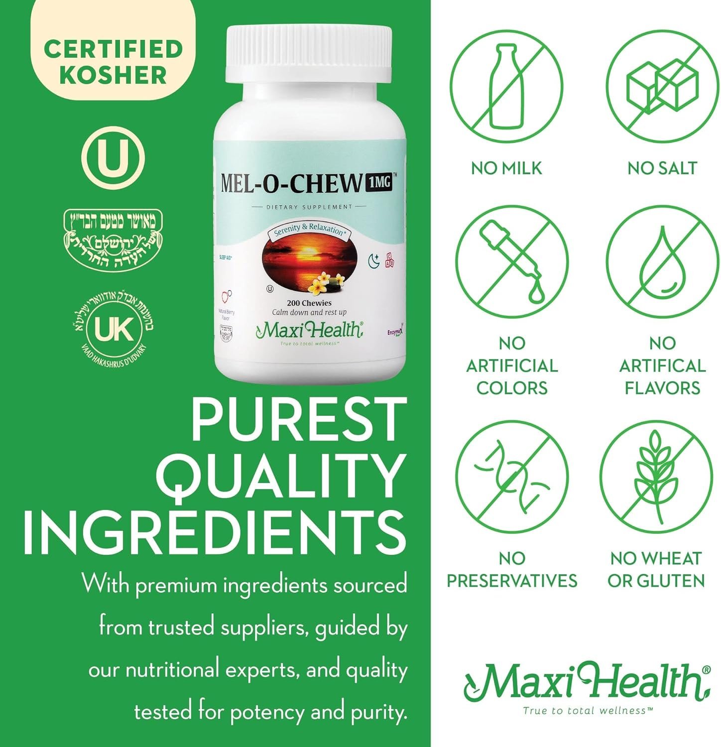 FAST-ACTING MELATONIN SUPPORT RESTFUL SLEEP: Maxi Health Mel-O-Chew delivers 1mg of pure melatonin in a chewable tablet; designed to help support your body’s natural sleep-wake cycle; this sleep supplement helps encourage restful sleep without grogginess