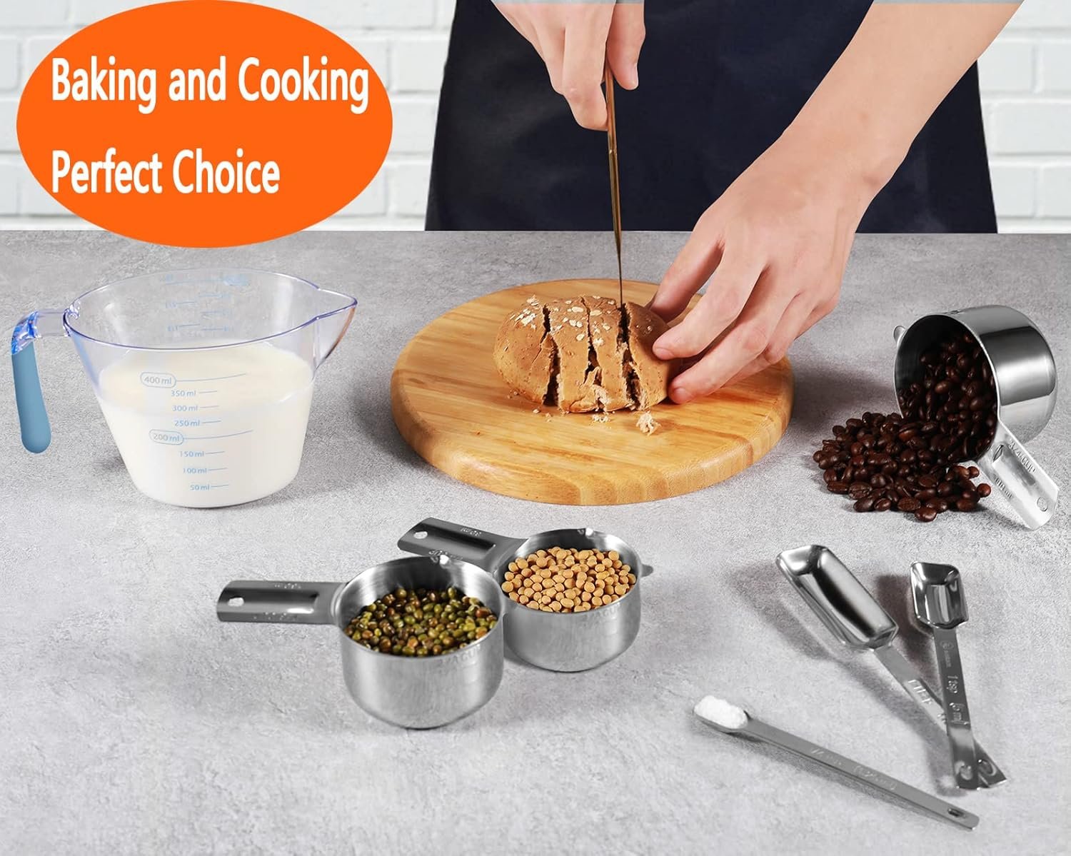 [Multiple Sizes of 19]: Including 7 stainless steel measuring cups (1 cup, 3/4 cup, 2/3 cup, 1/2 cup, 1/3 cup, 1/4 cup, 1/8 cup), 6 stainless steel measuring spoons (1 tbsp, 1 tsp, 3/4 tsp, 1/2 tsp, 1/4 tsp, 1/8 tsp), 3 liquid plastic measuring cup (4 cup, 2 cup, 1 cup), with 1 leveler, 2 metal rings. Meet all your needs on cooking and baking.