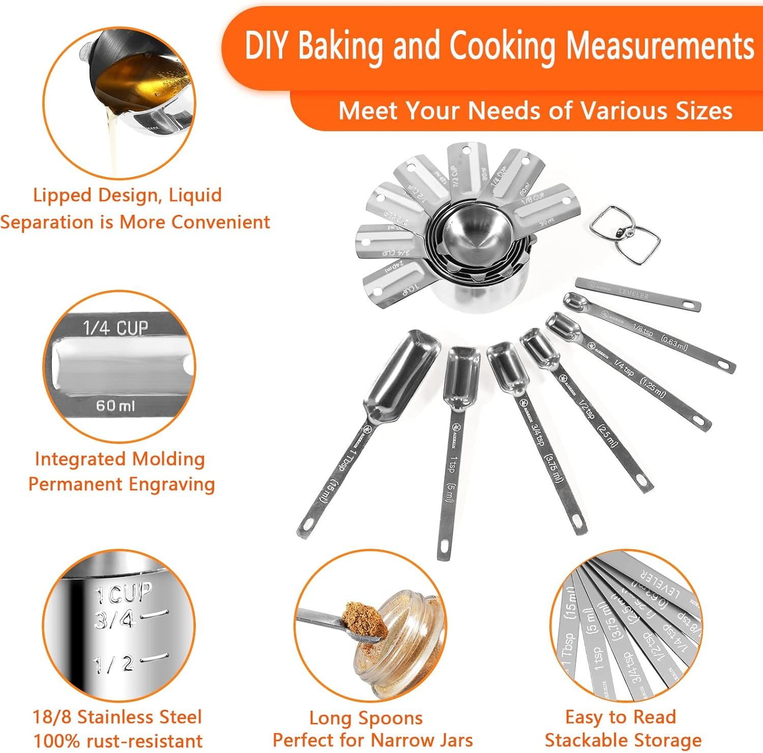 [Easy to Read Measure]: Each measuring spoons and cups is clearly engraved with the scale mark, making it easy to read the measurements. The rectangular design of the measuring spoons allows them to fit easily into small spice jars or herb containers, making it easier to measure both dry and liquid ingredients. With this measuring set, you can confidently create delicious food for your family and friends.